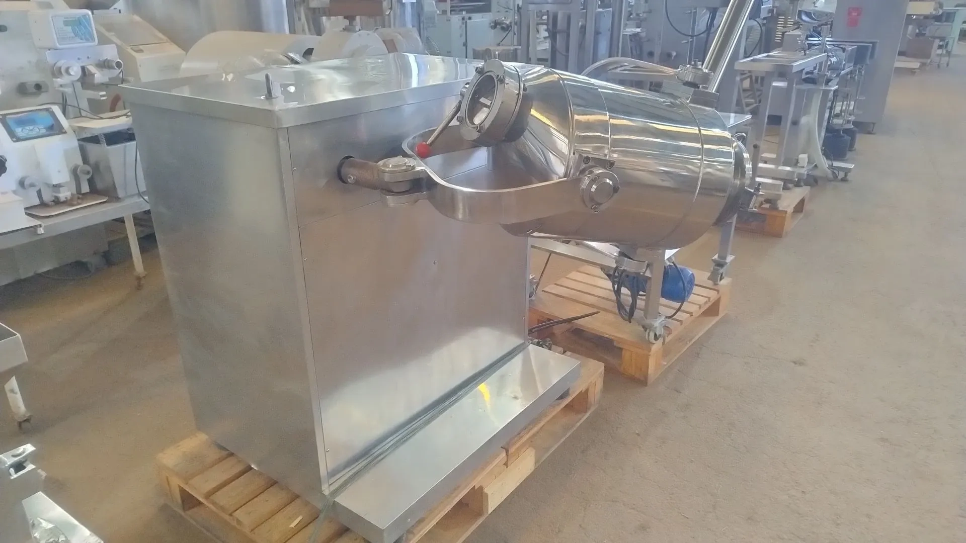 Misturador giratório tridimensional marca Baoyuda modelo HD-50. Volume do cilindro de mistura 50 L, volume máximo de carga 40 Kg. Sem uso. Voltagem 380 V trifásico. Peso total 250 kg.