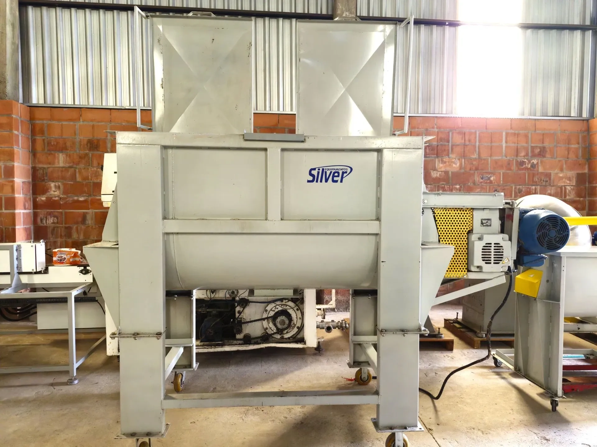 Misturador ribbon blender em aço carbono capacidade 1000 litros marca Silver. Com tampa bipartida. Com saída inferior tipo gaveta. Voltagem trifásico 220/380 v, 20 cv.