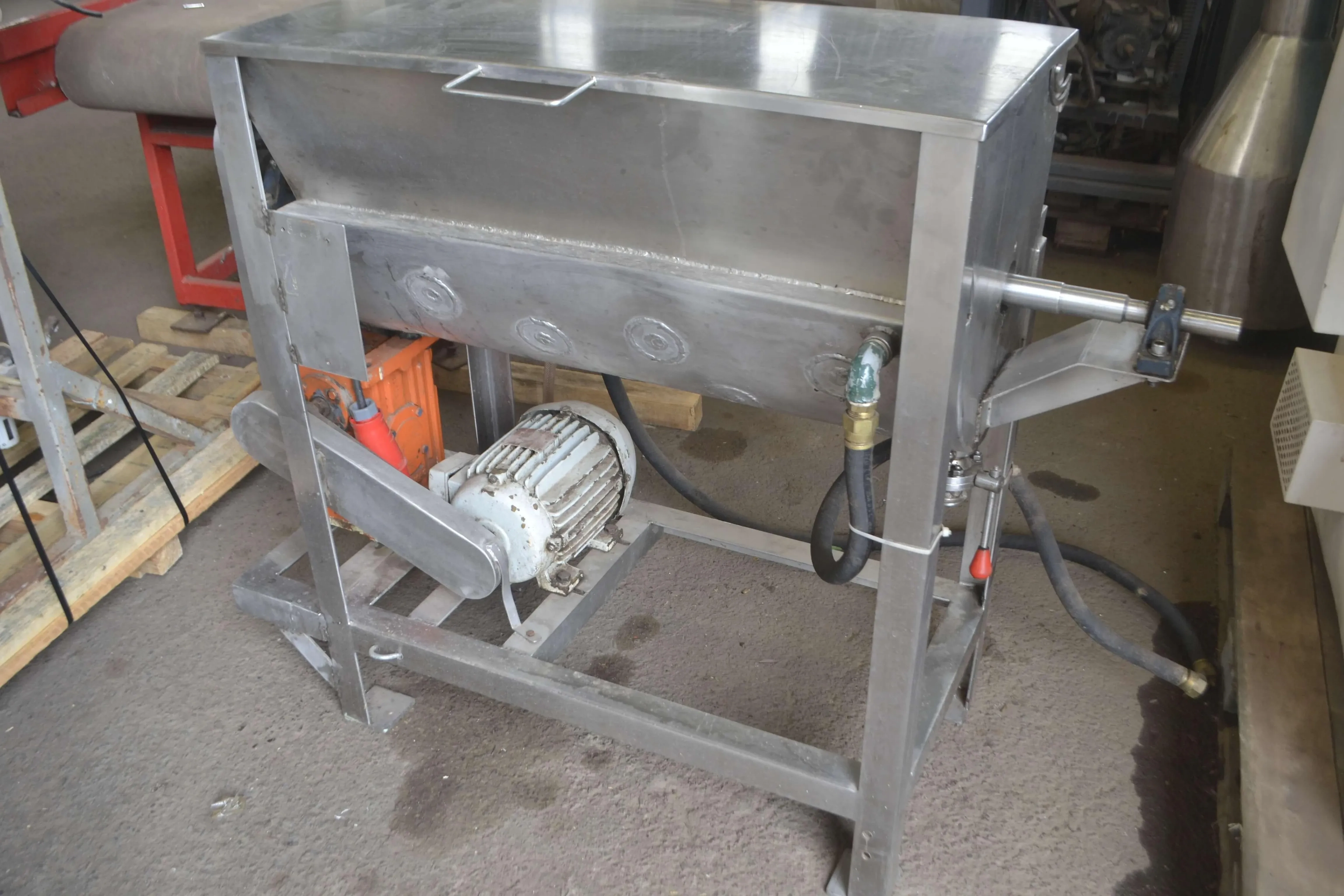 Misturador encamisado em aço inox capacidade aproximada 100 litros. Indicado para produtos líquidos, viscosos e semi-viscosos, tem entrada para água quente e funcionamento a banho maria. Escoamento inferior do produto. Com motor e redutor.