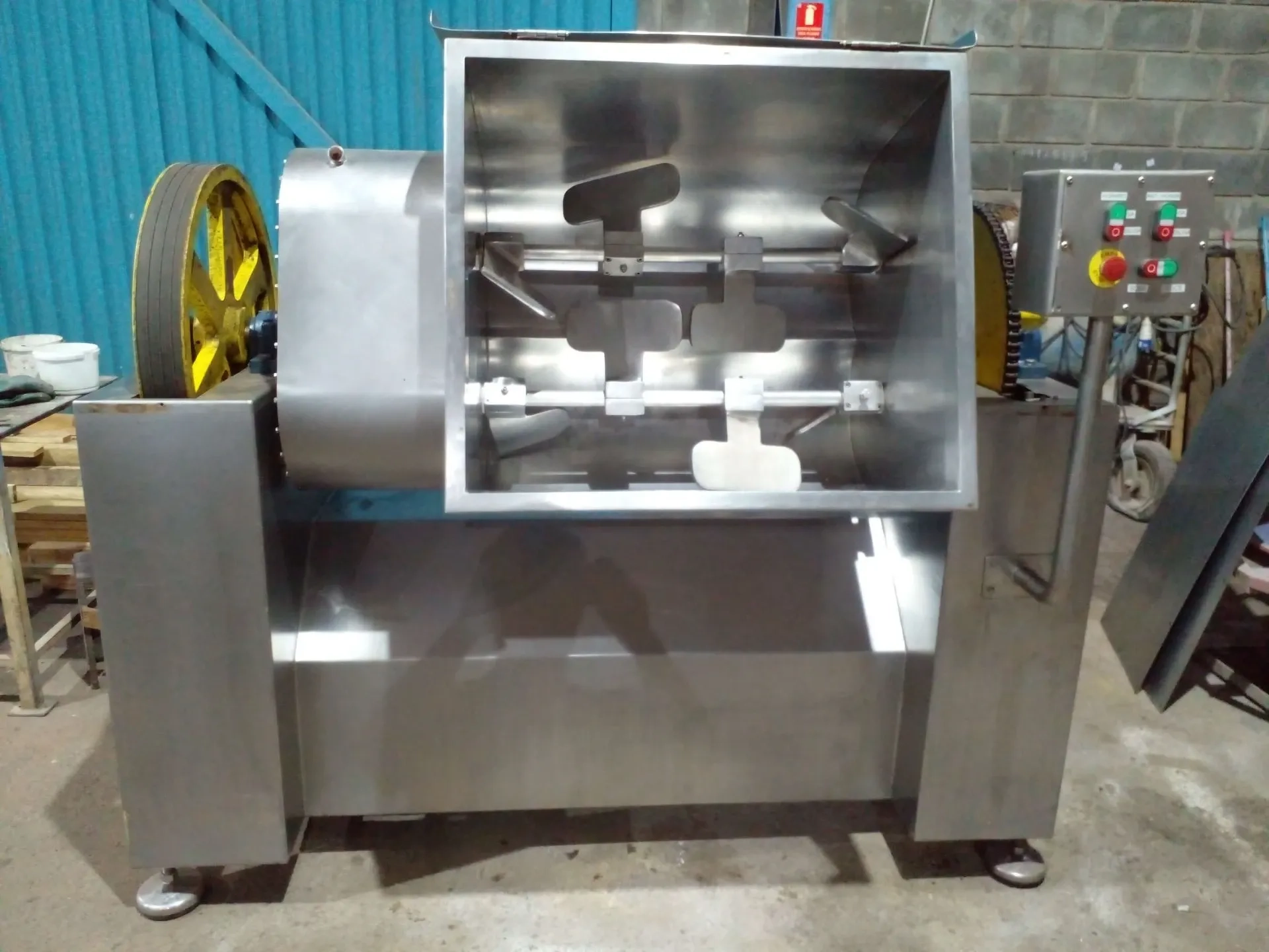 Misturador Horizontal de Carne de Palheta com 2 eixos. Capacidade de carne até 300 Kg. Indispensável na fabricação de embutidos. Projetada para misturar de forma homogênea a massa da carne, temperos e condimentos, proporcionando sabor e aromatização uniforme e consistente sem esmagamento ou separação da gordura. Bacia em formato especial para evitar acúmulo de massas. Com sistema basculante facilitando descarga do produto.