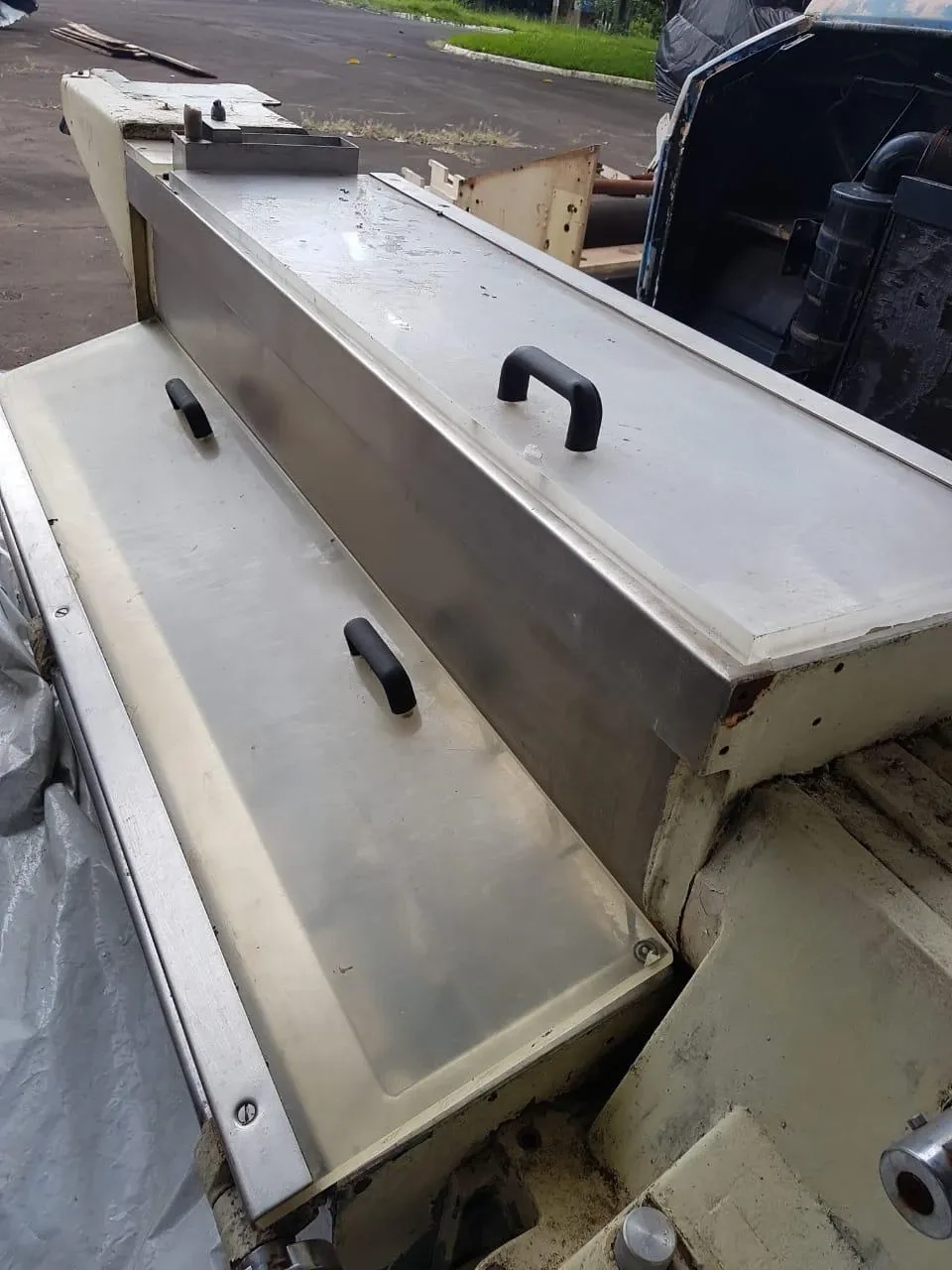 Misturador Horizontal de massas. Equipamento com três seções de misturadores independentes, em aço inox. Dimensões: 1.60 m x 350 mm.