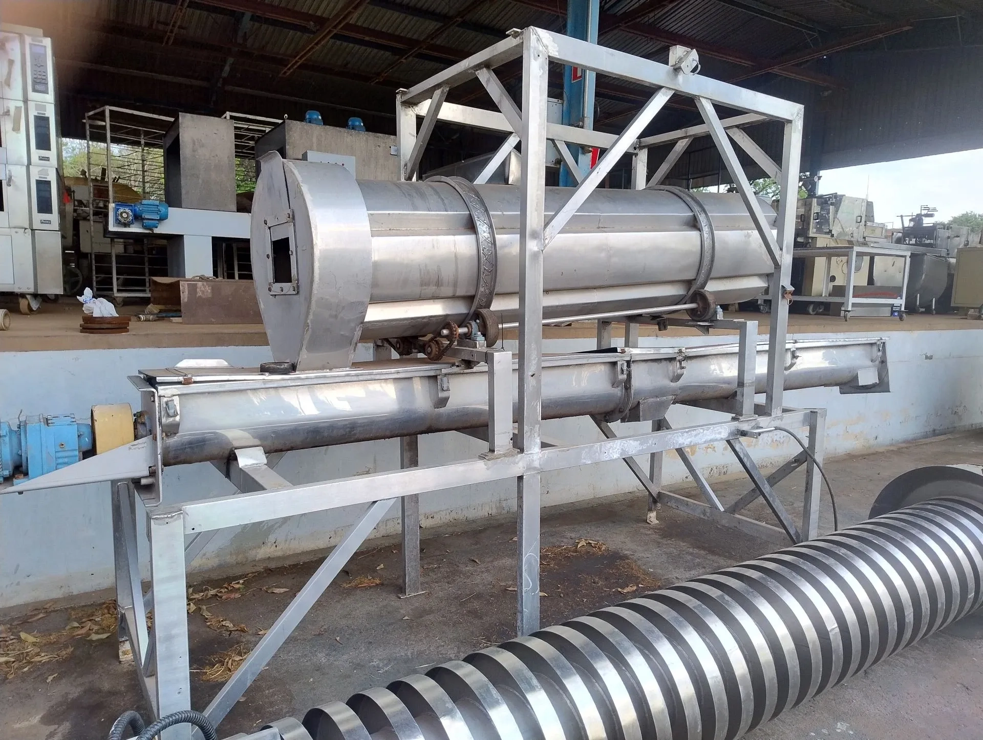 Misturador rotativo com rosca de extração. Em aço inox, o equipamento é composto de dois módulos. Módulo superior destinado à mistura de sólidos por sistema de tamboreamento. Módulo inferior composto de rosca transportadora de 4,3 metros para extração do produto misturado. Motor Trifásico 220/380 V. 1,5 Kw, 1720 RPM.