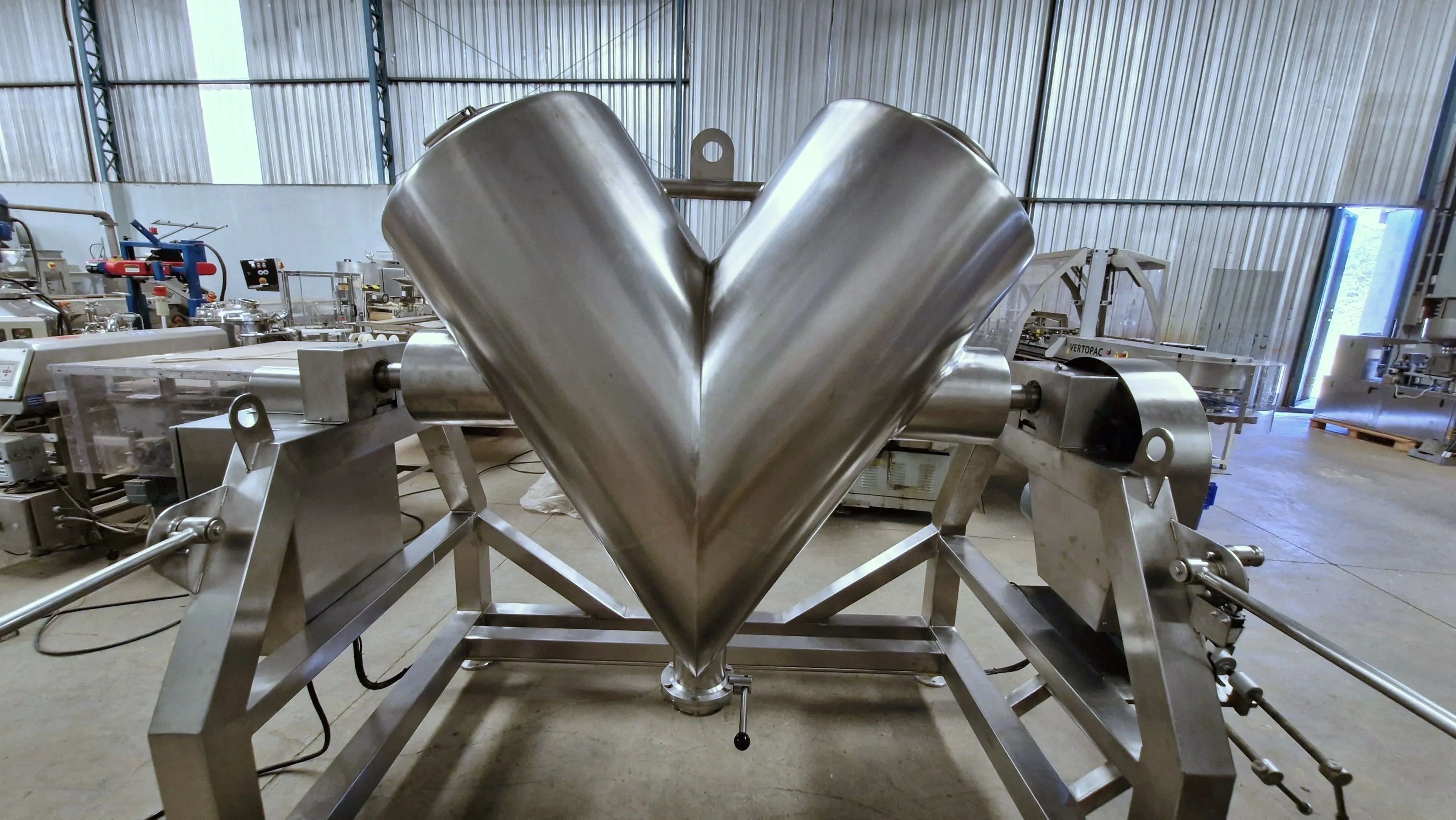 Misturador em V em aço inox 316 capacidade 600 L marca AD Martinelli. Origem Industria farmacêutica. Com polimento interno. Estrutura em aço inox. Solda entre corpo do V e eixo em aço inox. Equipamento comandando por CLP, com programações de ciclo. Com grade de proteção frontal com sensor micro de abertura. Válvula de saída de produto em aço inox. Motor com freio e com redução. Potencia do motor 3 KW. Rotação 1715 RPM. Voltagem 220/ 380 V.