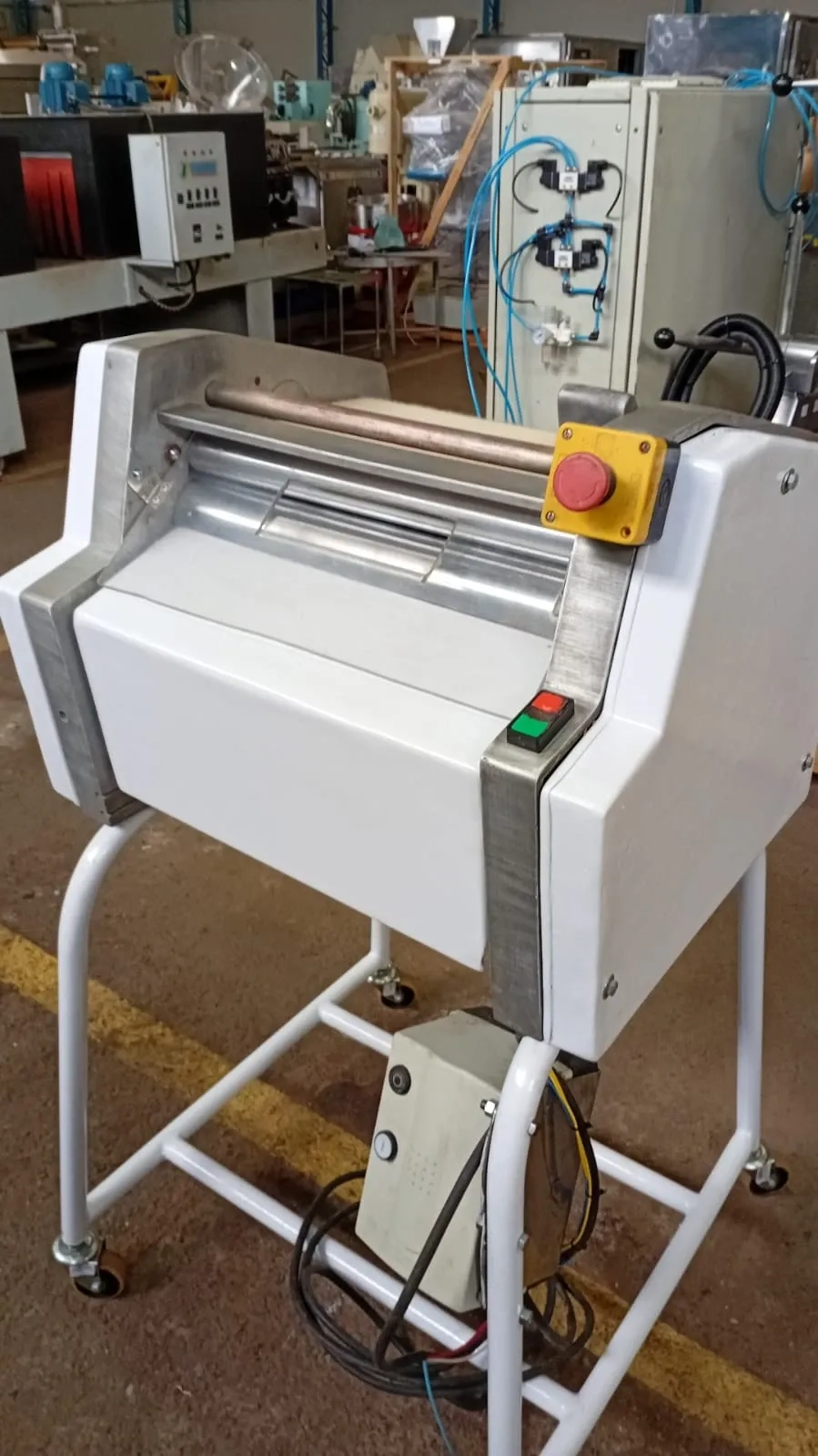 Modeladora de pães marca Mac Forno. Com cilindros em aço inox e estrutura em aço carbono com pintura epóxi, equipamento para uniformização e modelagem de pão francês, croissants e outros.