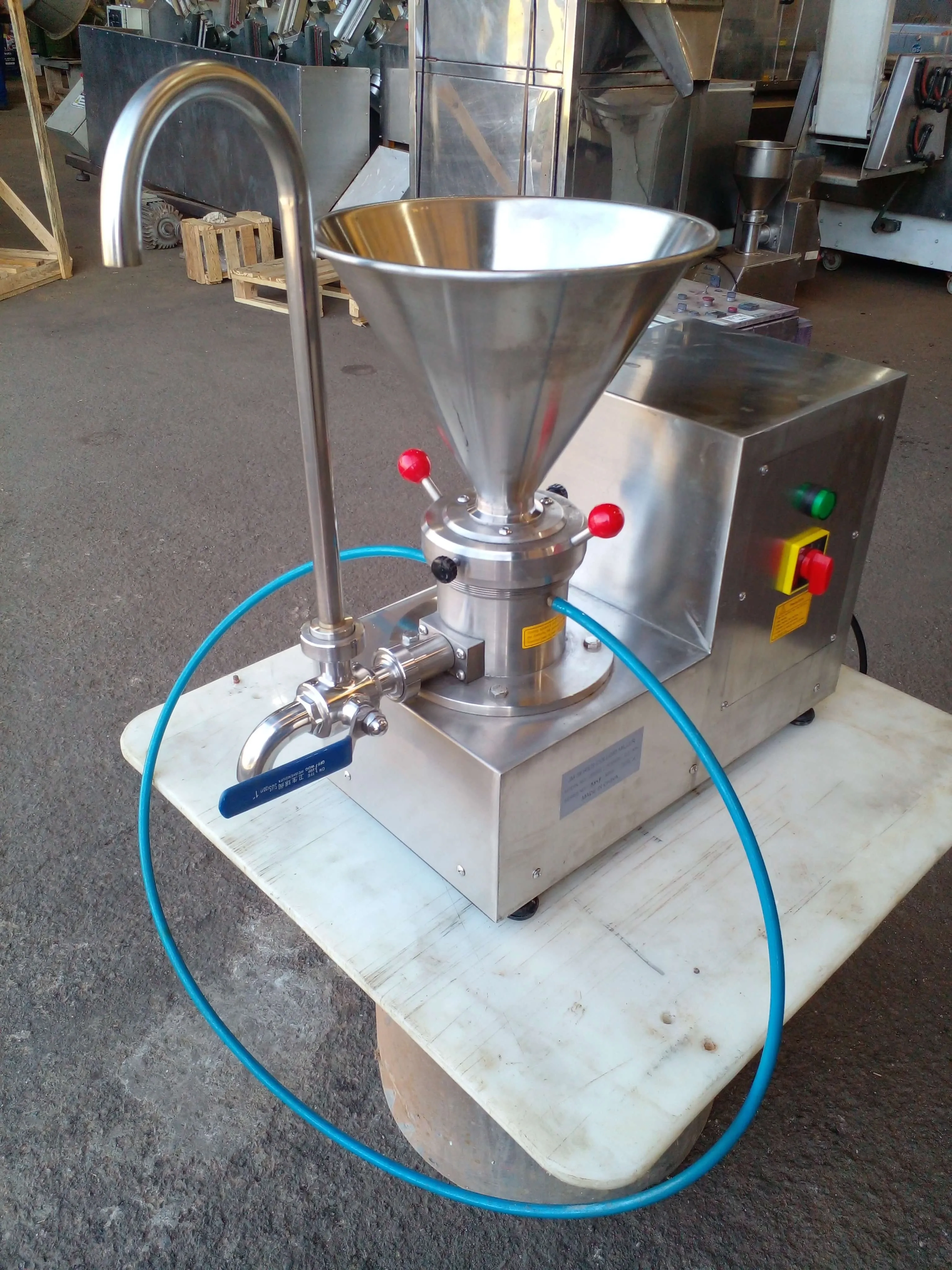 Moinho coloidal capacidade 60 Kg marca Huannyu. Indicado para a fabricação de pasta de amendoim e outras sementes, como o gergelim; é também utilizado na emulsificação de pigmentos. Voltagem 220 V Monofásica. Potência 2,2 KW. Peso 50 Kg. Granulometria (finura de processamento): 10-50 μm. Saída 50-700 K/h. Volume do funil 4,1 L.
