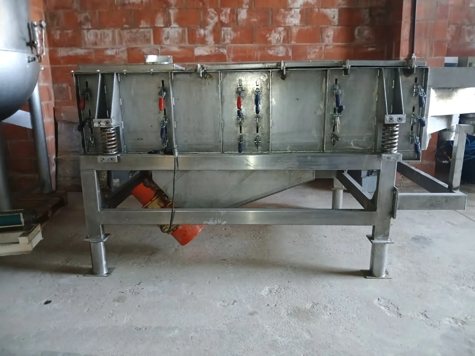 Peneira vibratória classificadora selecionadora em aço inox para peneiramento contínuo com 4 saidas de produtos. O equipamento possui 4 saídas para produto peneirados, selecionados e classificados por nível. Marca MVL máquinas vibratórias Donar. Equipamento possui dois motores vibradores na parte inferior (marca Donar modelo BR.200/2100/12).