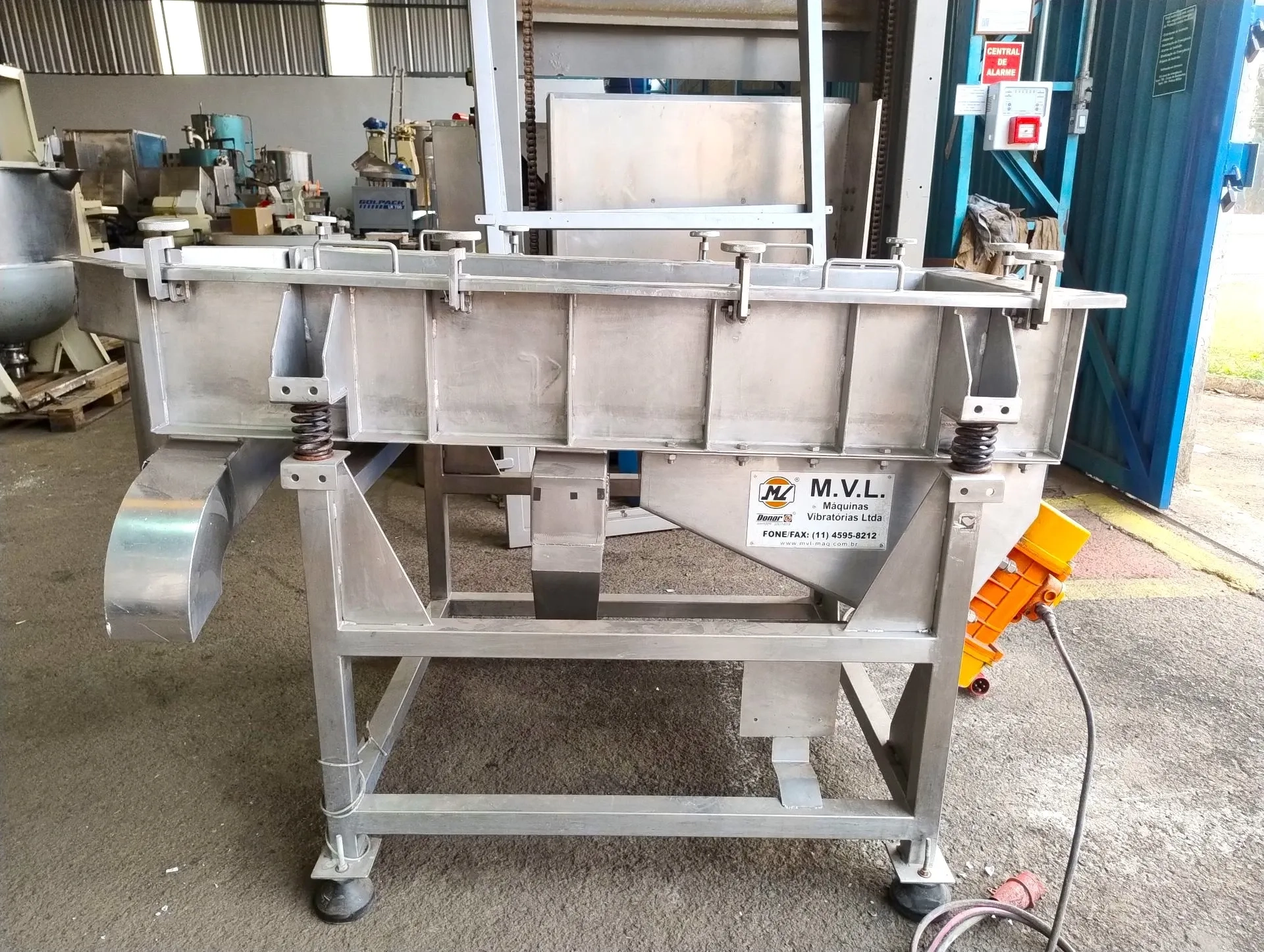 Peneira Vibratória Horizontal marca MVL modelo P.H 1500 X 600 1.D. A peneiras vibratória horizontal é utilizada na classificação de produto com uma função, com chapa perfurada em aço inoxidável com aberturas de 0,9 mm e 0,6 mm. Dispõe de bocais de alimentação e descarga, sistema de fixação dos decks por meio de gaveta. As Peneiras são acionadas por meio de 2 Motovibradores MVL que operam com rotações opostas, permitindo desta forma que as vibrações sejam dirigidas, ocasionando um transporte linear das partículas. Voltagem 380 v trifásico, 3,2 A, 60 Hz. Havendo necessidade de peneiramento com malhas inferiores a 1 mm, aconselha-se a aplicação de outros tipos de peneiras, também de fabricação da MVL Máquinas Vibratórias, como a Peneira Vibratória Circular ou a Peneira Vibratória Eletromagnética.