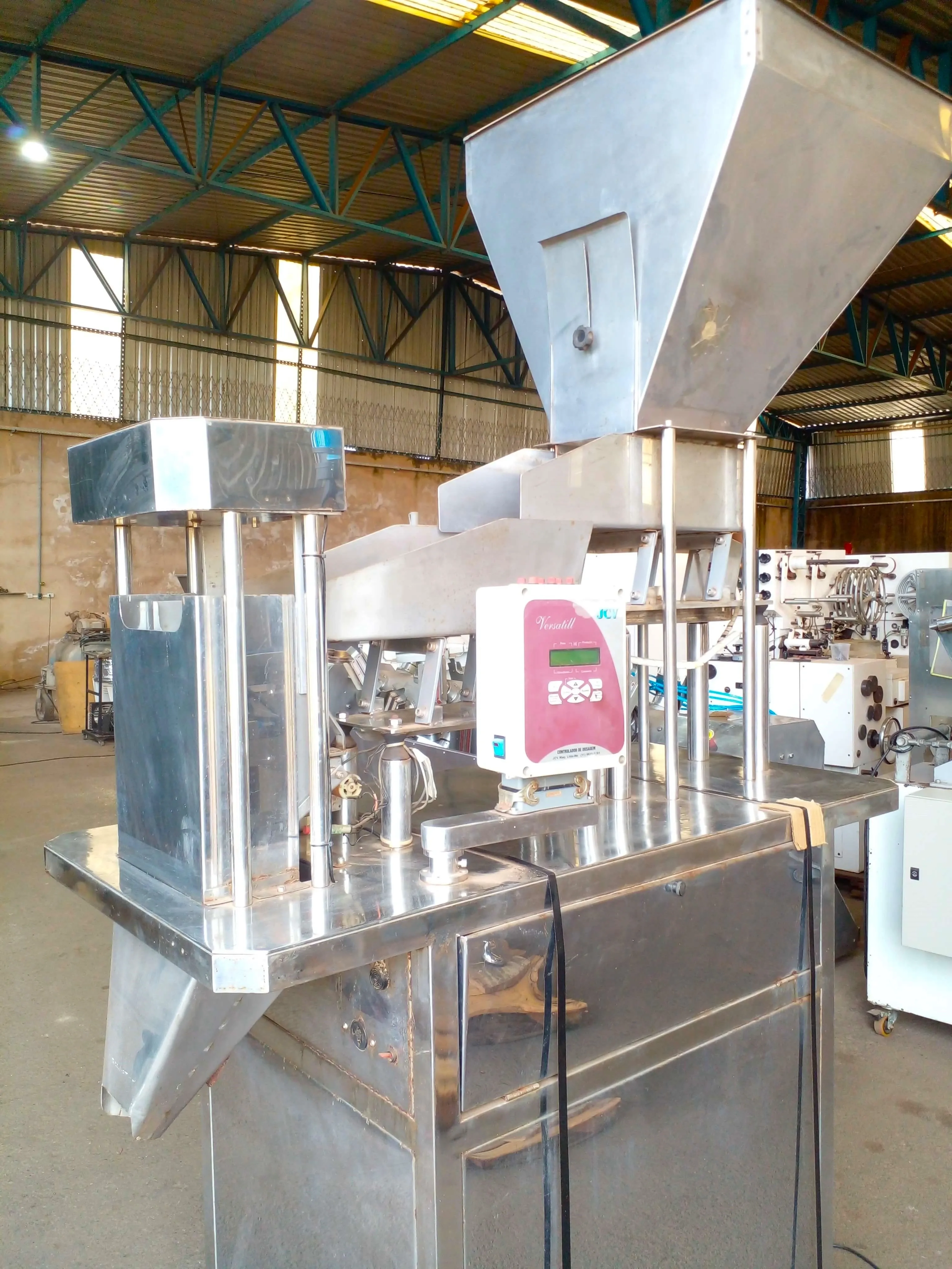 Pesadora Semiautomática marca JCV modelo Versatill. Esta pesadora é Indicada para biscoitos, batata chip/palha, bolachas, pururuca/torresmo, rações, grãos maiores (castanhas, nozes, etc.), produtos congelados (salgados, pães, pão de queijo, massas, carnes em cubos e tiras, etc.), peças plásticas, parafusos e pregos, entre outros. Peso até 1 kg. Acabamento - estrutura em aço carbono com pintura epóxi e partes em contato com o produto em aço inox, ou, estrutura e peças em contato com o produto construídos inteiramente em aço inox 304. Sistema de dosagem com três calhas, partes em contato com o produto em aço inox, peças removíveis sem utilização de ferramentas. Capacidade de pesagem de produtos secos 30 g a 1 Kg (ou conforme peso e densidade do produto). Capacidade de pesagem de produtos congelados 200 g a 5,0 Kg. Produção média de 600 unidades por hora.