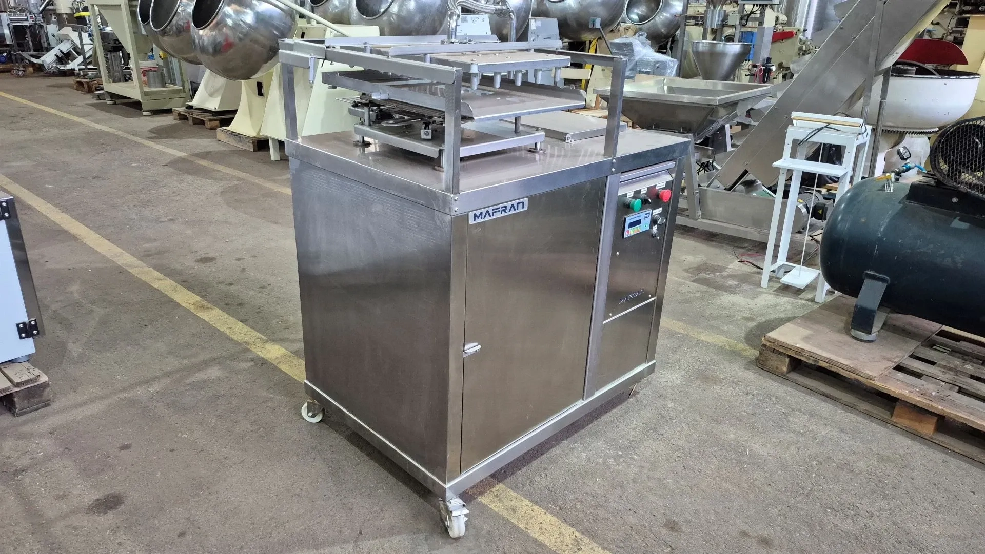 Pingadeira de biscoitos marca Mafran. Confeccionada em aço inox 304. Para massas leves,como biscoitos de polvilho, samantas, tareco, carolinas, éclair entre outros. Acionamento por botão ou pedal, capacidade de bombeamento 100 kg/h. Voltagem 90-240 V monofásico, potência 150 W. Capacidade do tacho 40 kg. Capacidade produtiva de 5 segundos por bandeja, tamanho da bandeja 40 x 60 cm. Painel CLP com ajuste de dosagem. Peso 115 kg.