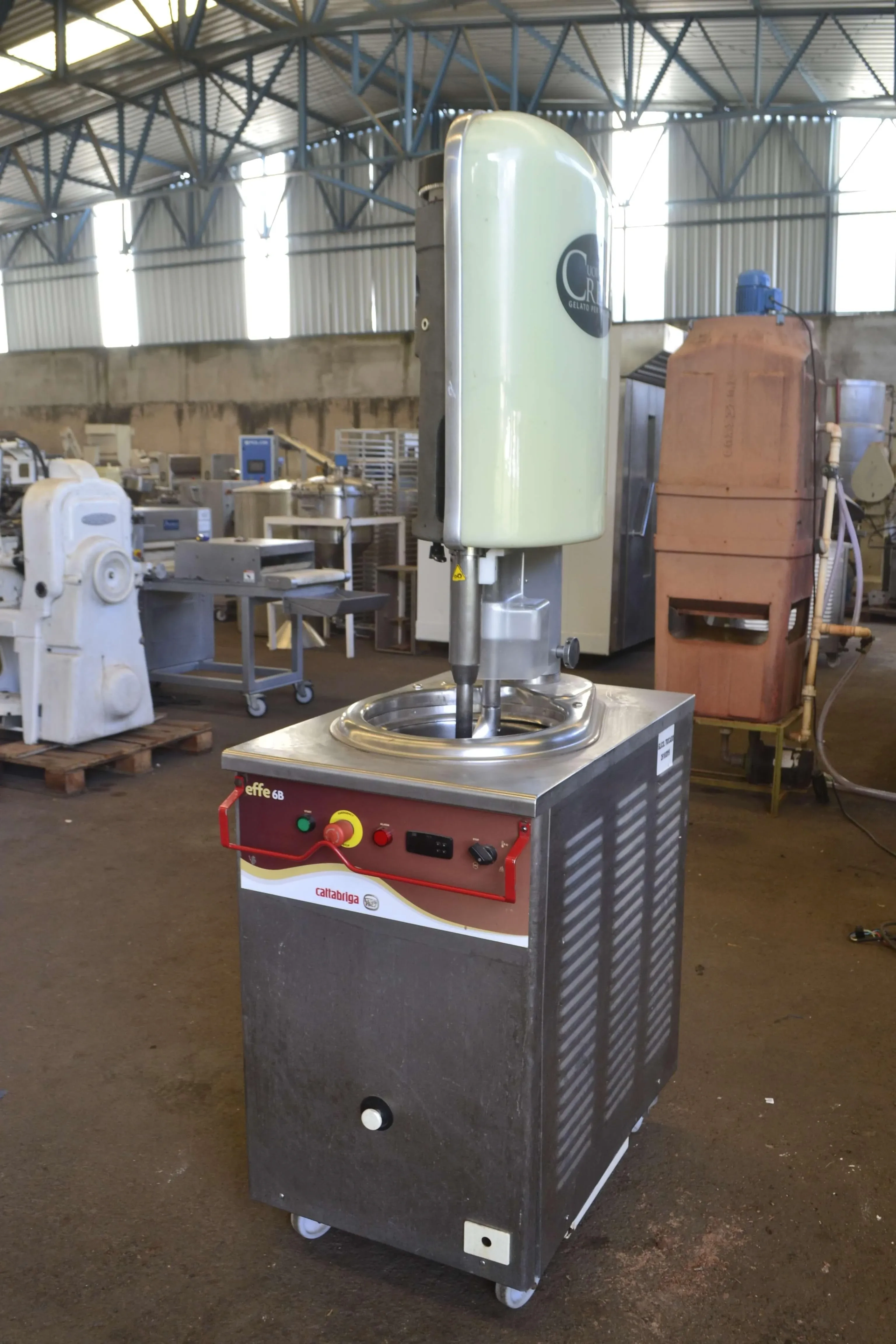 Produtora de Sorvete marca Cattabriga modelo EFFE 6. A produtora gira e a mistura segue em direção a sua parede fria, onde a água se transforma em cristais de gelo dando corpo à massa de mistura líquida. Em seguida, uma espátula especial, com movimento delicado e descontínuo, único no mundo, se desprende e espalha sobre uma superfície de aço inox. Totalmente revisado e em conformidade com as normas de segurança. Produção por ciclo de 6 litros. Alimenteção 380V/50Hz/3. Potência instalada 3,3 Kw. Potência do motor do compressor 2,2 Kw. Potência do motor do agitador 1,1 Kw. Anticongelante (diluido a 50 %) 18 litros. Consumo de água de 200 l/h.