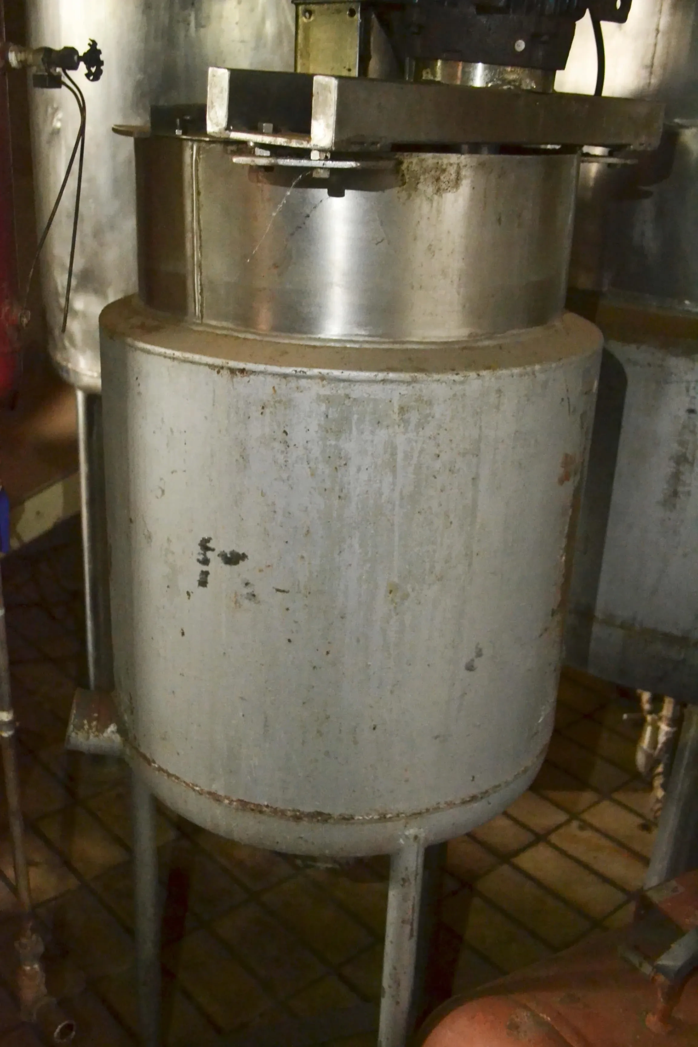 Reator para maionese capacidade 90 l. Equipamento encamisado, à vapor, com camisa externa em aço carbono e interna em aço inox. Com mixer para emulsificação do produto e mexedor.