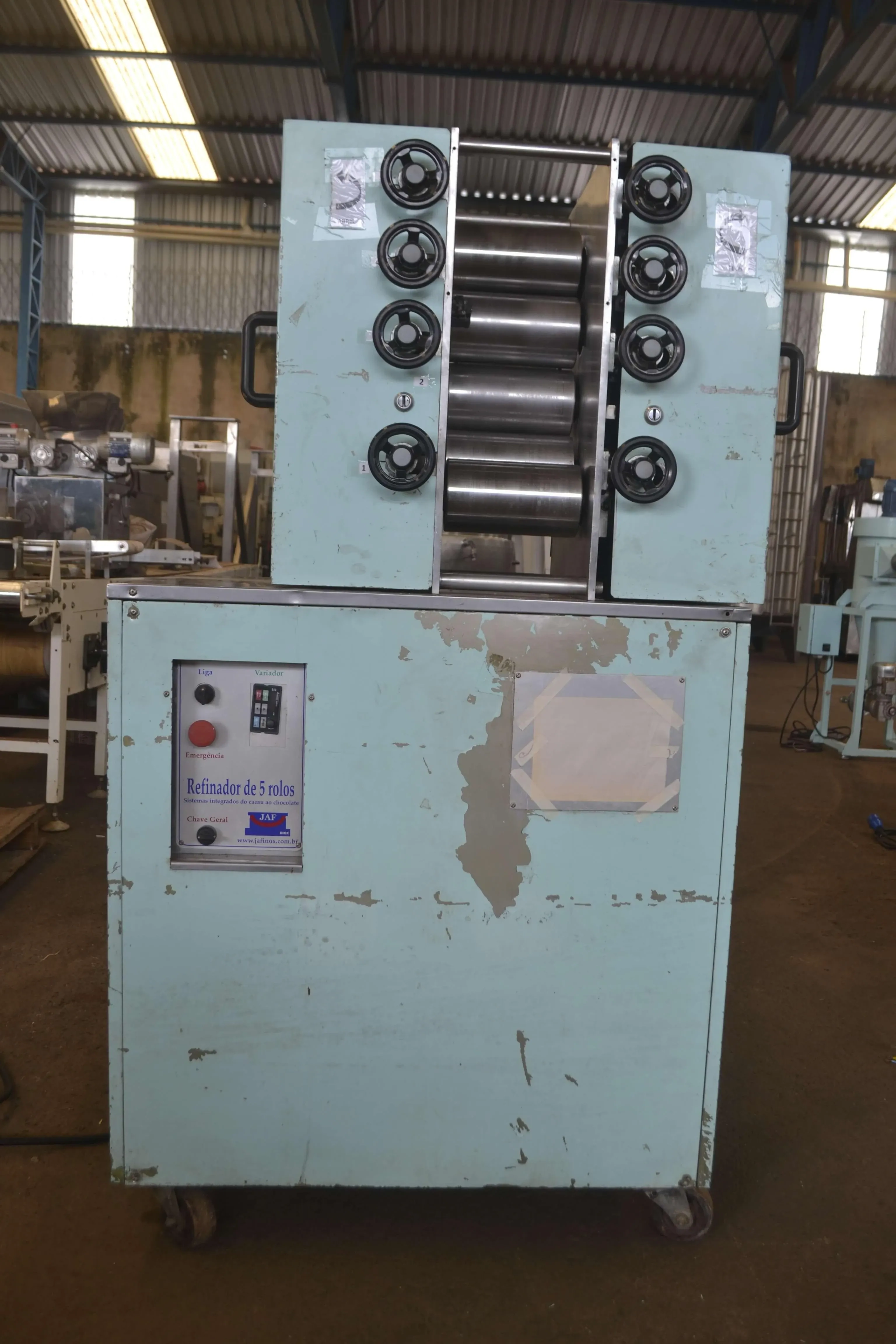 Refinador de 5 rolos com resfriador marca Jaf Inox. O refinador de 5 rolos foi especialmente projetado para os chocolateiros de pequeno e médio porte que desejam usar um sistema de refino tradicional. Os rolos resfriados de alta precisão garantem uma distribuição homogênea de partículas e um fluxo sólido reológico suave de sua massa de cacau, composto, chocolate e cremes.