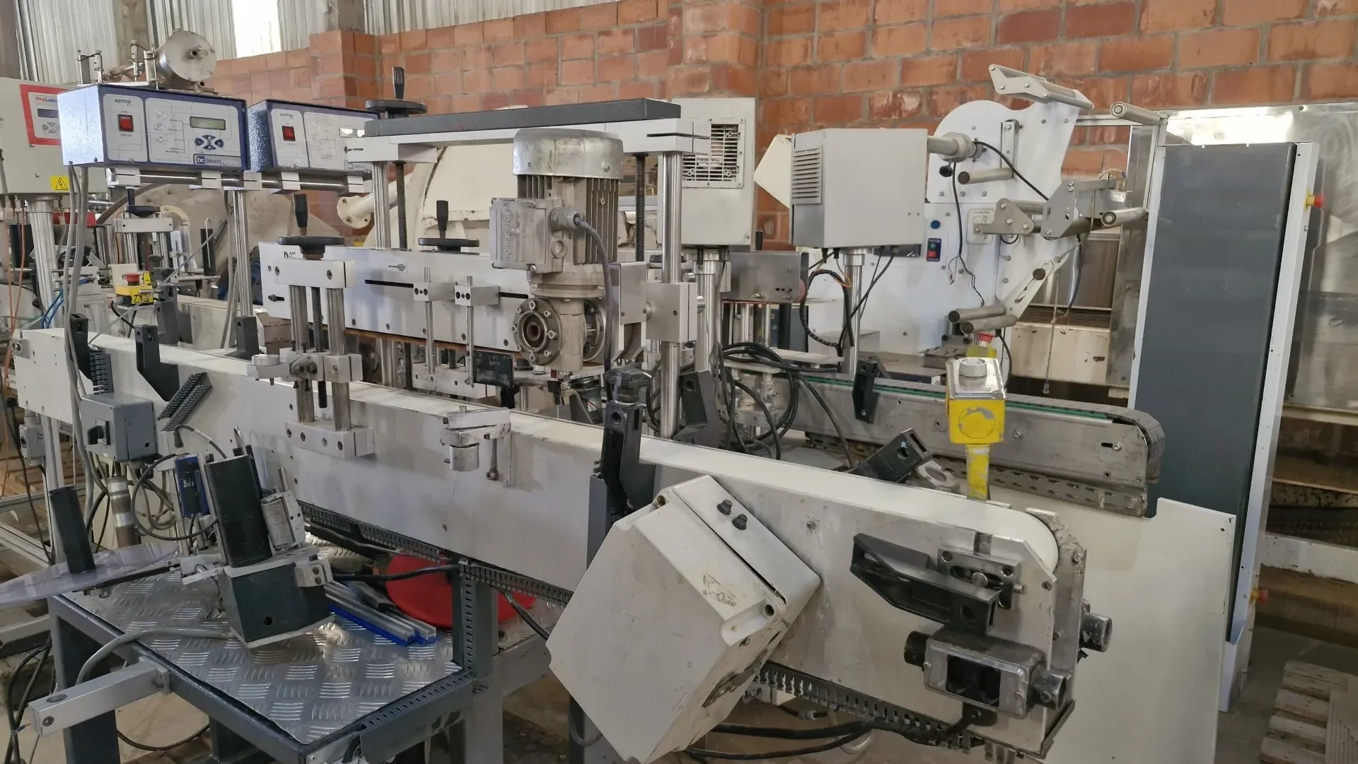 Rotuladora automática cabeçote duplo para rótulos auto adesivos marca Bauch Campos. Para frascos,potes,garrafas aplicação frente e verso. Com dois cabeçotes. Com alinhador centralizador e esteira superior para alinhar os frascos. Motor Bonfiglioli. Inversor de frequência WEG.
