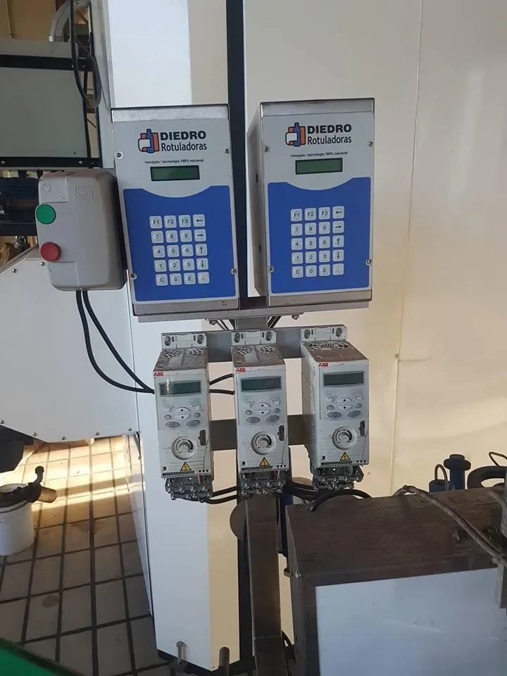 Rotuladora Diedro. Equipamento seminovo para rotulagem de embalagens cilíndricas ou cônicas, com capacidade de até 3200 aplicações.