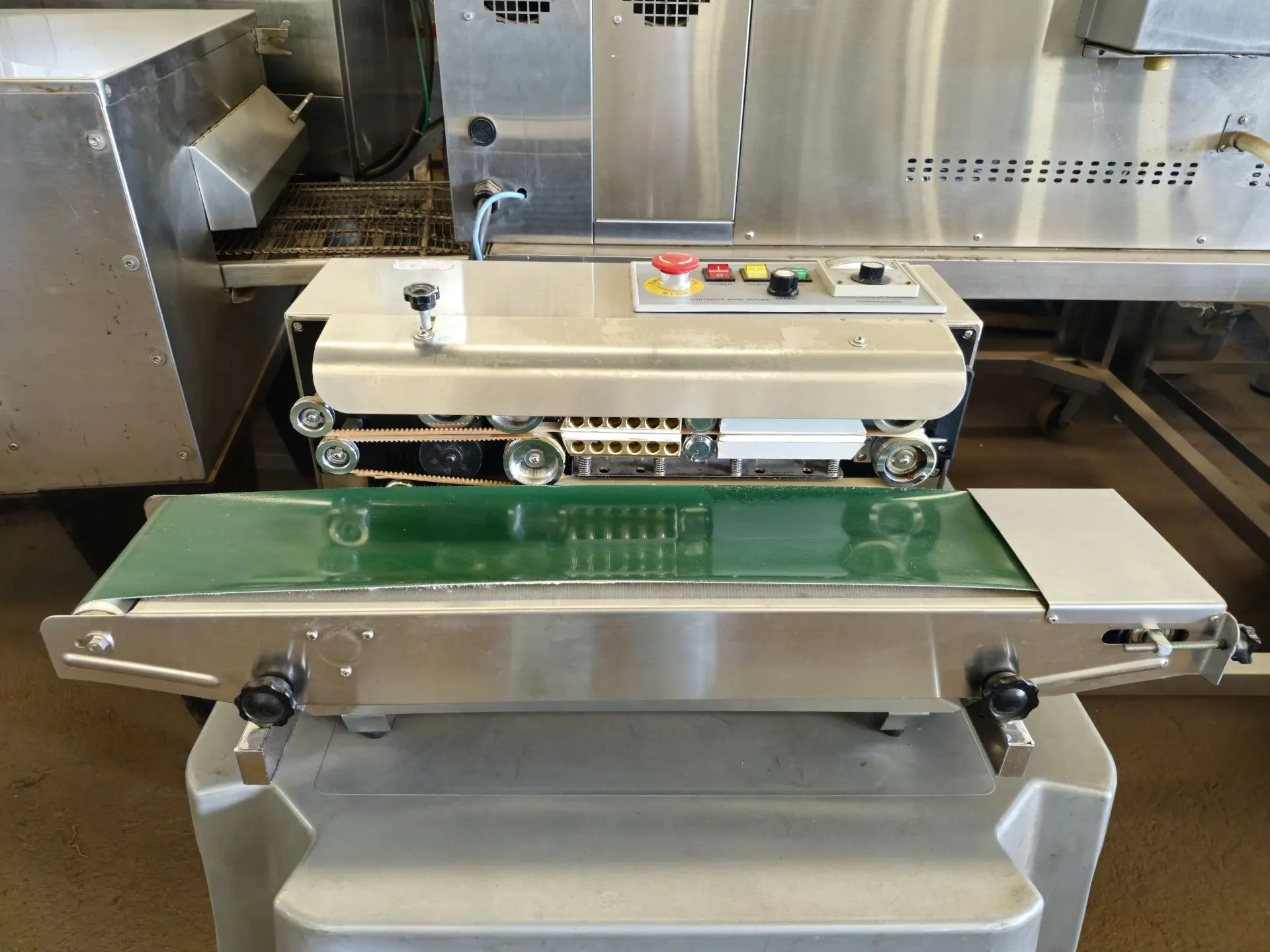 Seladora de bancada horizontal automática em aço inox. Possui controle de velocidade para ser ajustado conforme a espessura da embalagem e a temperatura da selagem. A seladora automática é capaz de selar qualquer embalagem plástica tais como: polietileno, polipropileno, bopp, nylonpoli, aluminizadas, pode também selar papel grau cirúrgico e cartelas (solapa colocada em temperos, condimentos, mel. etc..). Pode selar produtos que contenham líquidos, como molhos e conservas. Tensão 220 v.
