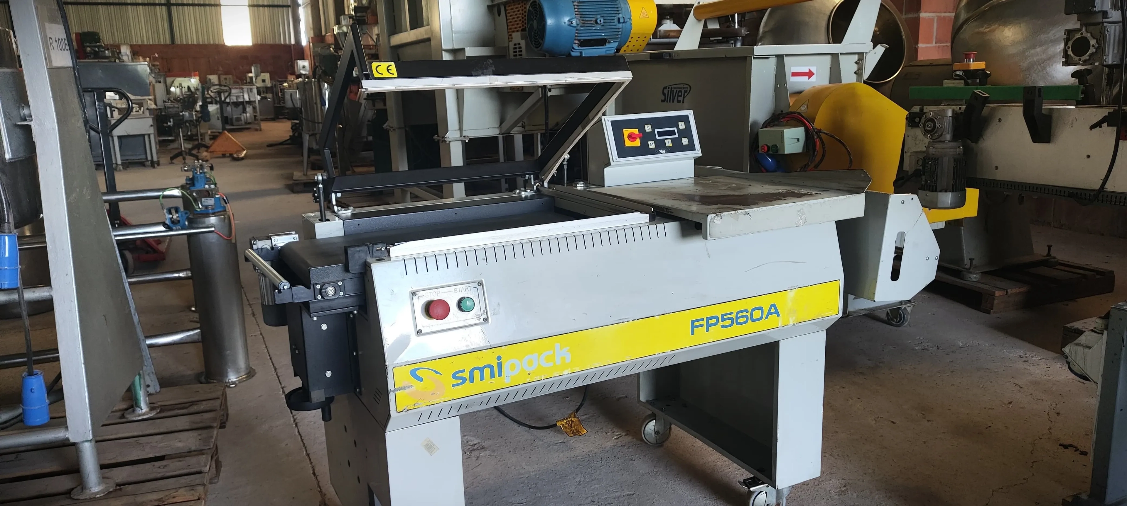 Seladora em L com túnel de encolhimento aquecimento marca Smipack. Modelo da seladora FP560A, modelo do túnel de encolhimento T450. Para pacotes de embalagens. Anos de fabricação 2011 e 2012 respectivamente, motores elétricos marca Bonfiglioli. Disponíveis 2 unidades da seladora em L, e 2 unidades do túnel de encolhimento shrink.