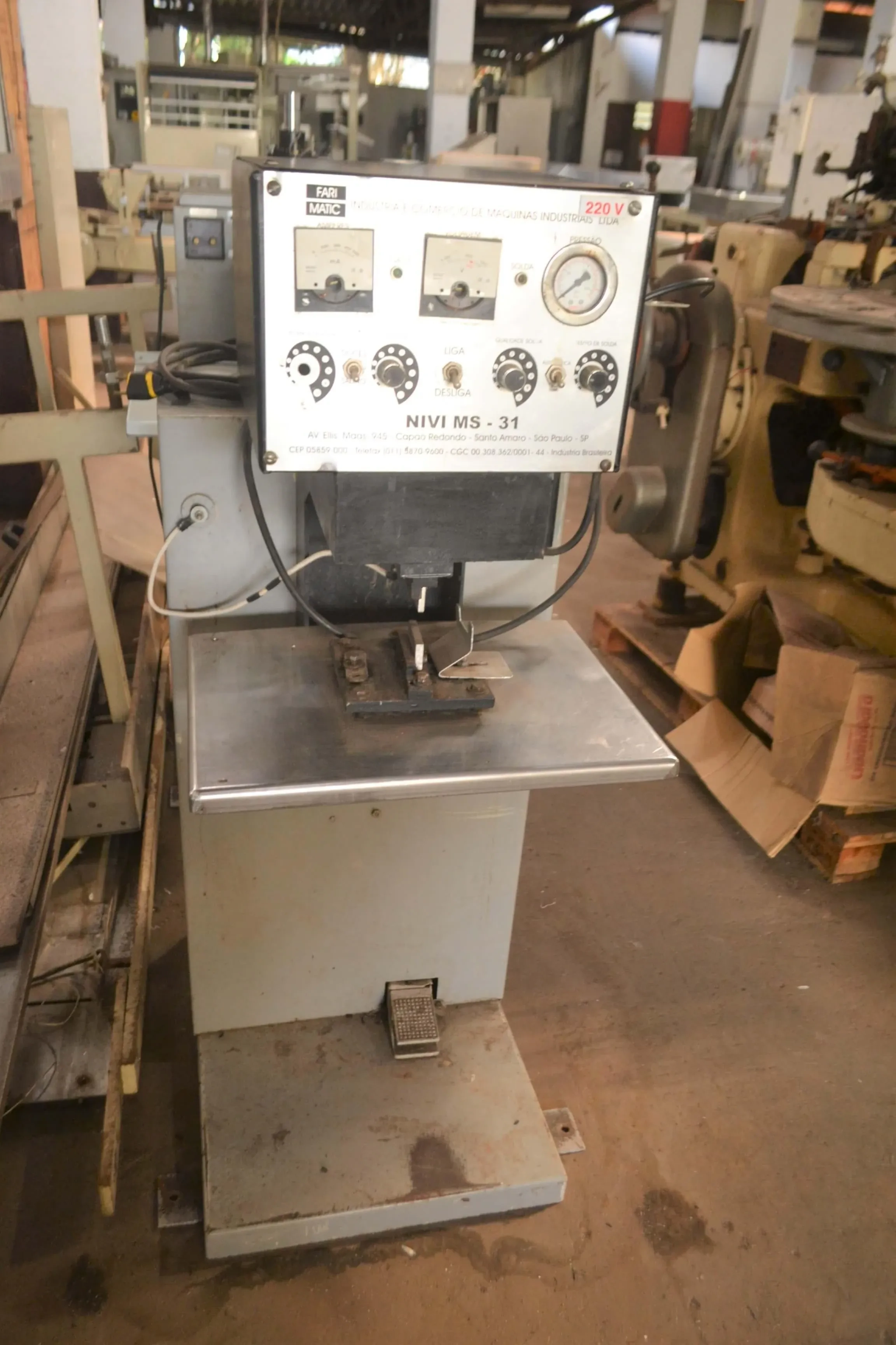 Seladora de sachê de melzinho, doce de leite e outros marca Fari Matic. Modelo: NIVI MS - 31. Equipamento semiautomático utilizado para a solda de 'cordões de sachê. Duas unidades disponíveis. Voltagem: 220 V. Dimensões dos Equipamentos: Equipamento 1: - largura: 0,60 mts - comprimento: 0,78 mts - altura: 1,30 mts Equipamento 2: - largura: 0,60 mts - comprimento: 0,90 mts - altura: 1,50 mts