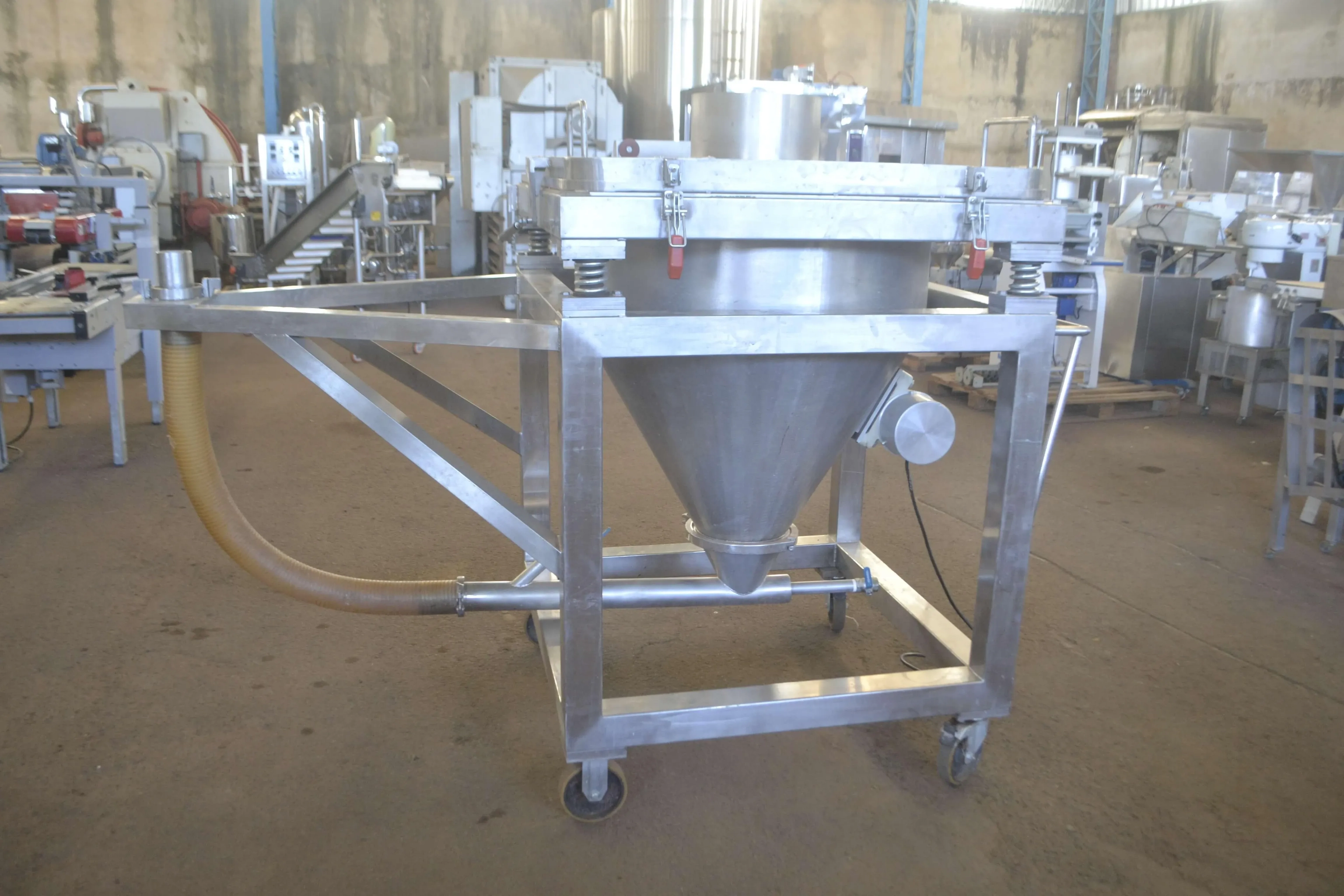 Silo para pós com sistema de transporte. Em aço inox, com sistema de molas e vibração, com dutos (para ar comprimido) para circulação de pós.