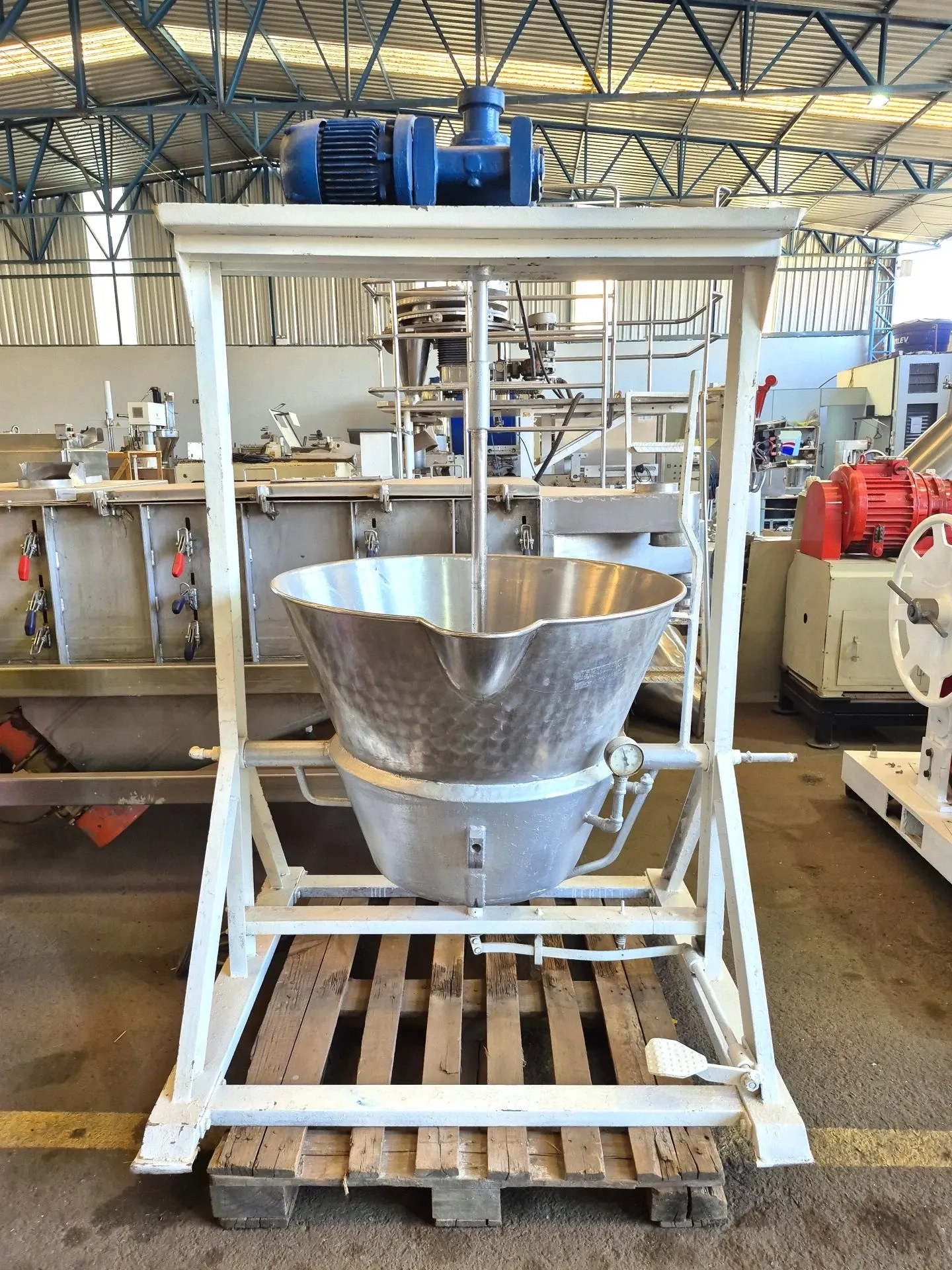 Tacho à vapor encamisado basculante capacidade 200 litros. Com estrutura em aço carbono.