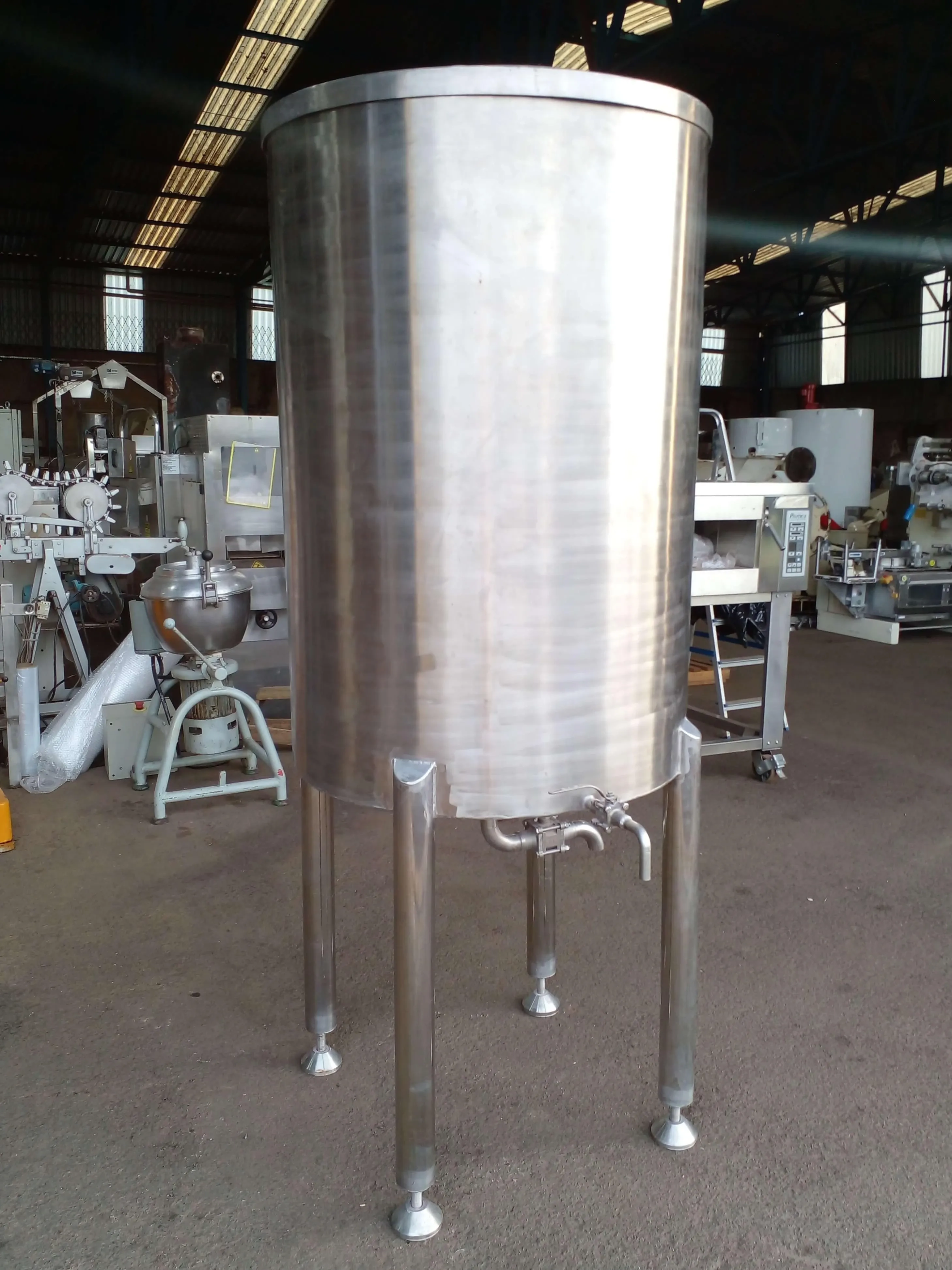 Tanque de armazenamento em aço inox capacidade 850 litros. Com sapatas reguladoras de nível em aço inox. Diâmetro da saída principal 35 mm. Diâmetro da saída secundária 18 mm.