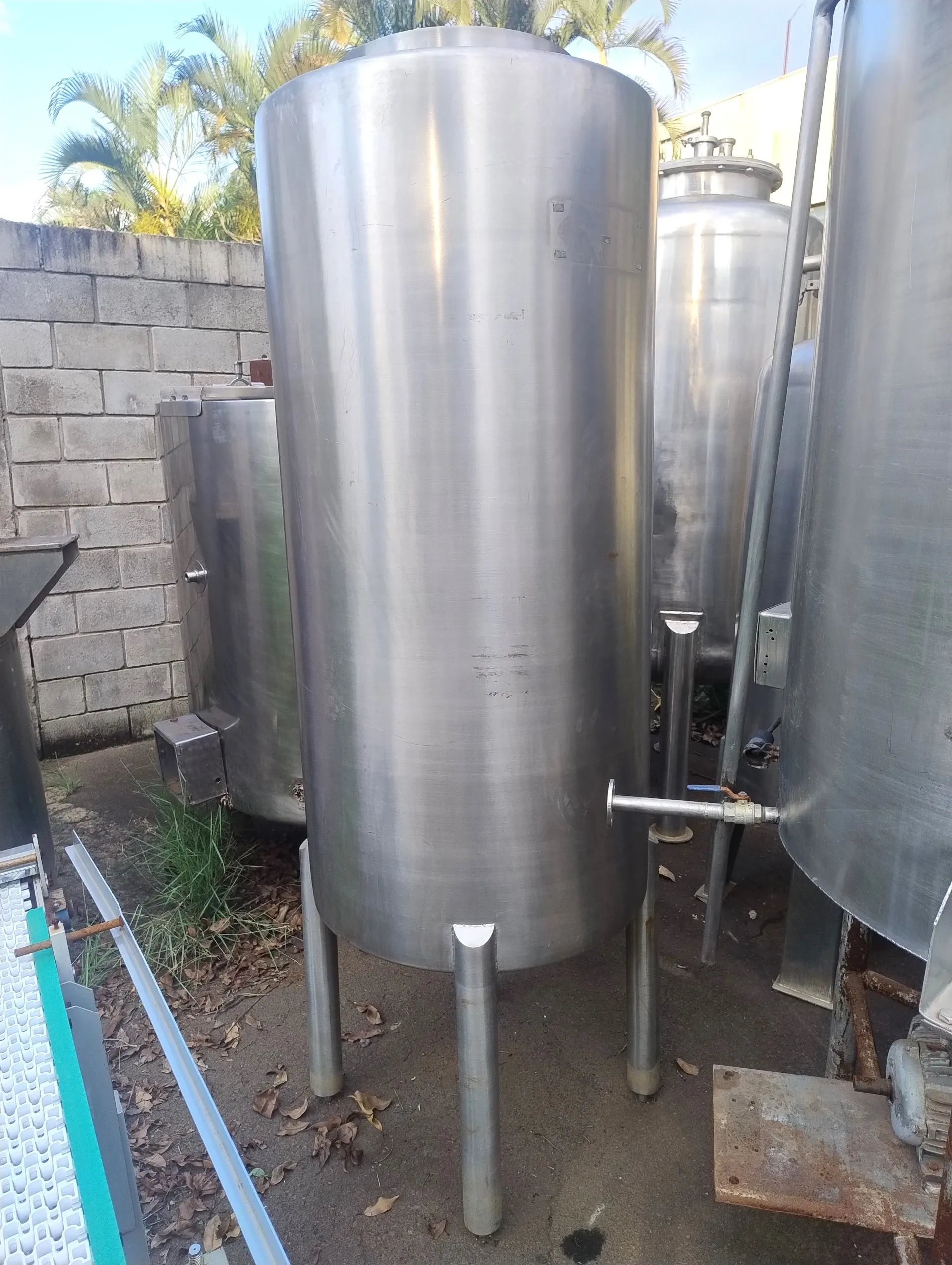 Tanque de armazenamento em aço inox capacidade 600 litros. Diâmetro entrada superior 450 mm. Diâmetro da saída principal 6 cm.