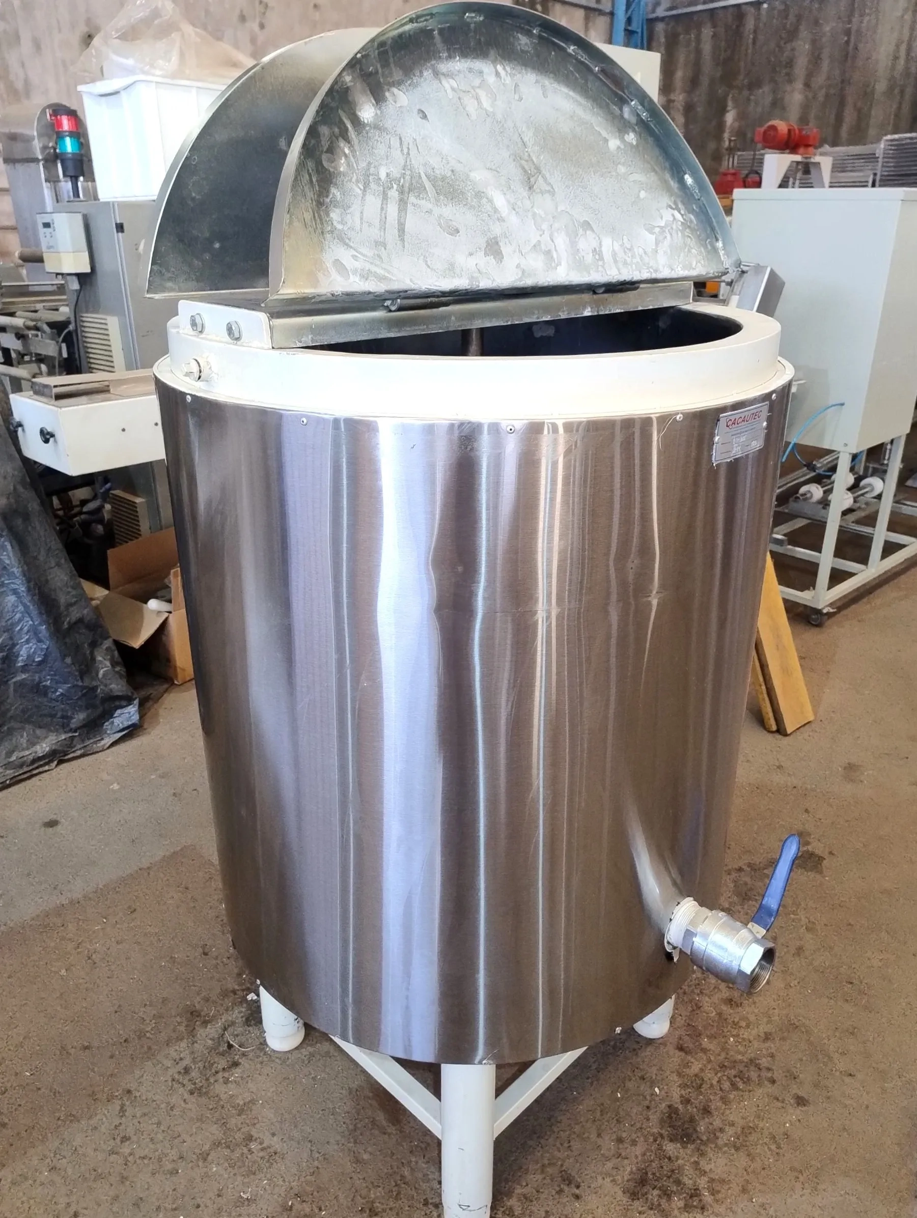 Tanque derretedor marca Cacautec modelo TQ 300 capacidade 440 litros. É fabricado em aço inox externo e aço carbono interno. O tanque derretedor derrete e armazena chocolate. A máquina é composta por um depósito cilíndrico, que é uma câmara de fundo duplo para circulação de água e aquecimento através de resistências reguladas por um controlador digital, que asseguram uma temperatura constante em todas as partes que mantém contato com o produto. Para uma conservação eficaz do produto, o sistema possui pás giratórias, o que mantém o chocolate em movimento. O equipamento é composto de: resistências elétricas para aquecimento da água, sensor de segurança, evitando que o tanque seja ligado com o chocolate ou a gordura ainda dura, impedindo danos no moto-redutor, porta de inspeção, painel elétrico completo.