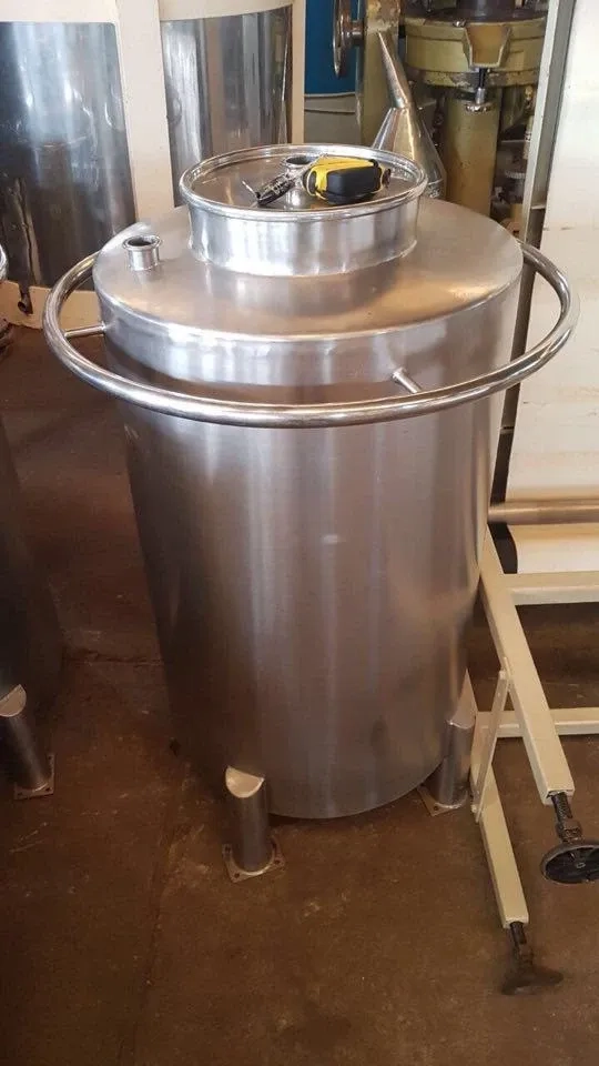 Dois tanques reservatórios em aço inox total com alças para manuseio.
