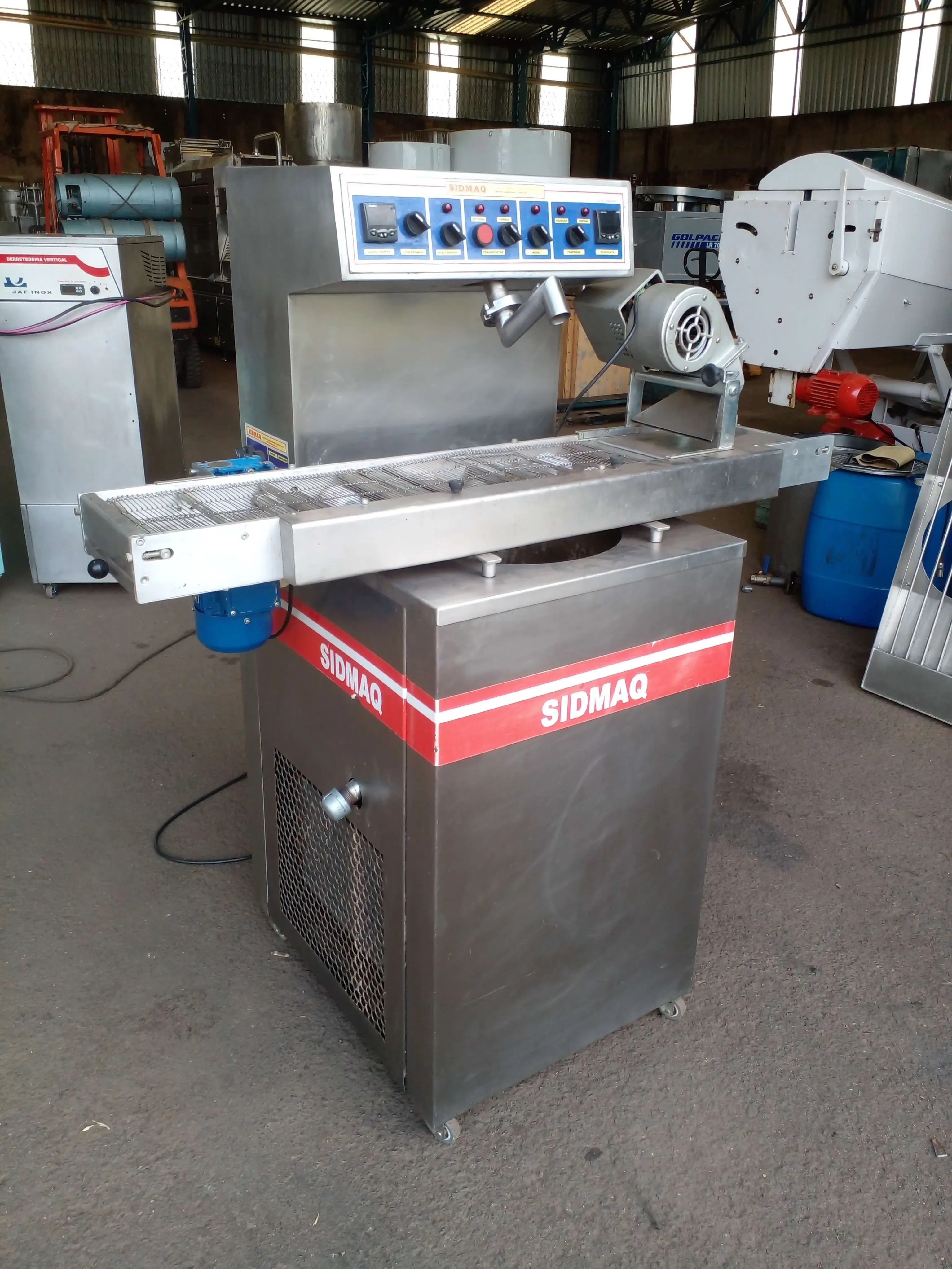 Temperadeira com cobrideira acoplados marca Sidmaq modelo TP-120 MV. Capacidade da temperadeira até 120 Kg. Largura da cobrideira 200 mm. Equipamento com construção robusta em aço inox escovado, de fácil manuseio e totalmente automática. Acompanha mesa vibratória. Voltagem 220 V. Potência 2,10 Kw/ H.