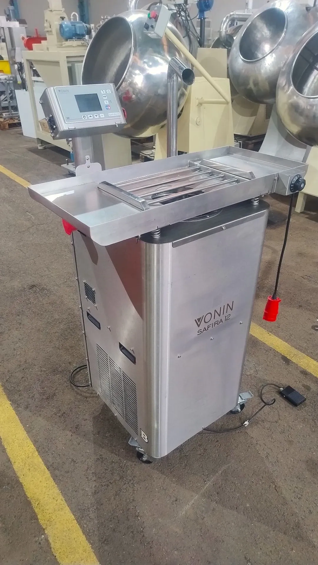 Temperadeira de chocolate contínua marca Vonin modelo Safira 12. Dispõe de sistema ChocoSense. Possui tela TouchScreen de 7”. Produz até 12 kg de chocolate temperado em 10 Minutos (adicionando o chocolate já derretido na máquina). Capacidade da cuba reservatório de 12 kg. Tensão 220 V monofásica, 60 hz.
