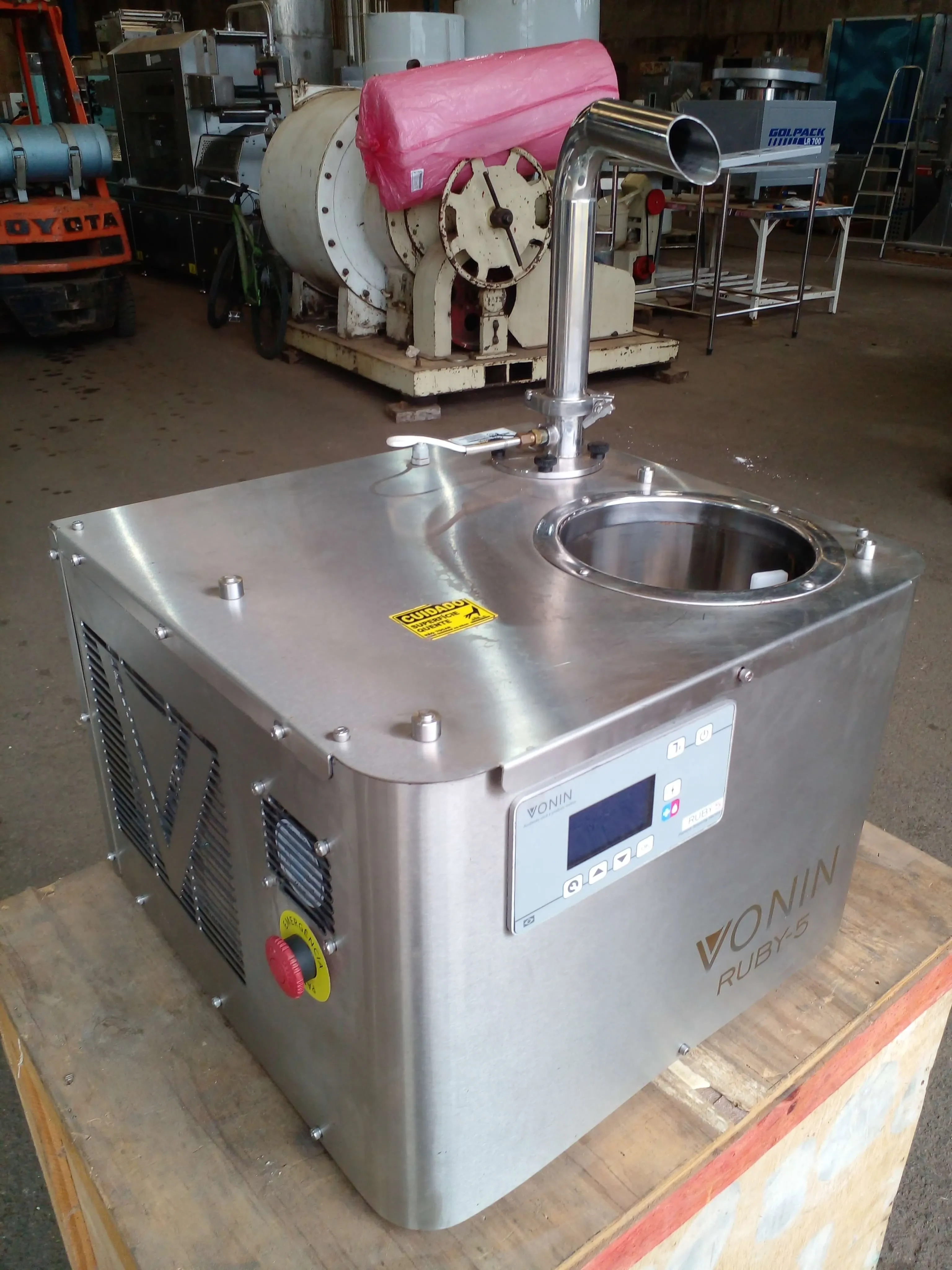 Temperadeira de Chocolate marca Vonin modelo Ruby 5. Produz até 5 kg de chocolate temperado em 8 minutos, e até 15kg de chocolate por hora trabalhando com chocolate já derretido. Possui memória para gravação de diferentes curvas de cristalização para diversos tipos de chocolate. Corpo, partes de contato e acessórios em Aço INOX 304. Tensão 220V/ Monofásica/ 60hz. Consumo 2,9 kW/h. Peso líquido 50 Kg. Rosca transportadora de fácil remoção. Rosca com sistema de reversão para fácil esvaziamento da máquina.