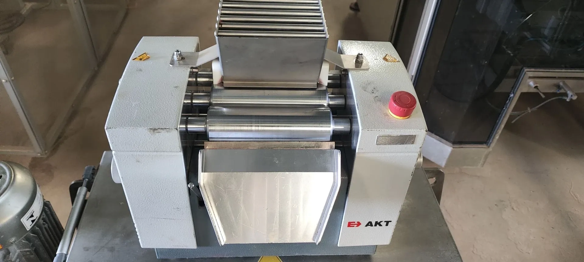 Tri cilindro refinador de rolos de bancada para laboratório de P&D marca Exakt (Alemanha). Utilizado para controle de qualidade ou micro produção de alimentos, cosméticos, indústria química entre outros setores. Ano de fabricação 2015. Largura do cilindro 140 mm.