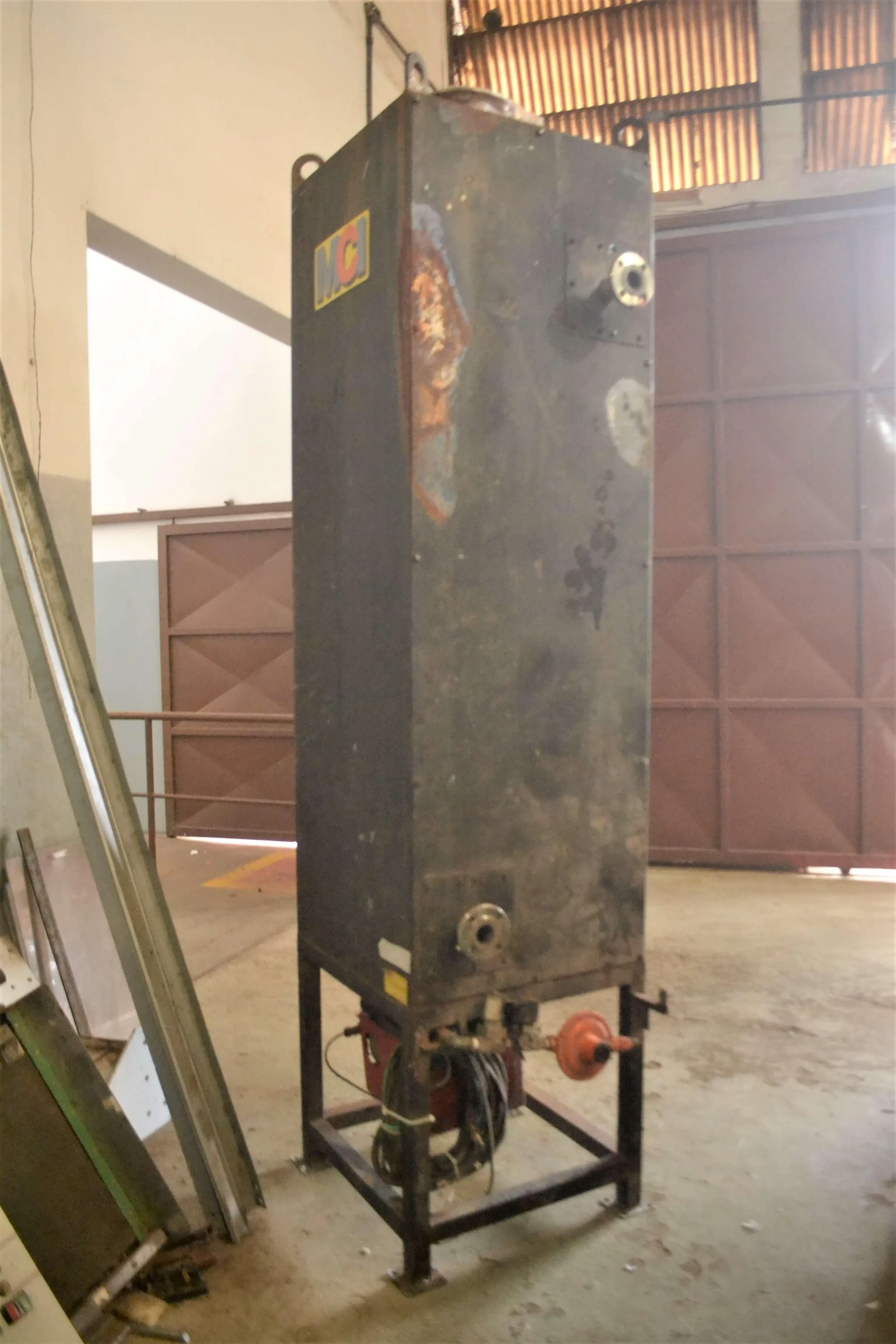 Trocador de calor helicoidal a gás marca MCI. Voltagem: 230 V ~ 50 hz. O equipamento atendia a fritadeira contínua de salgados congelados (Multifry - capacidade 300 Kg/hora).