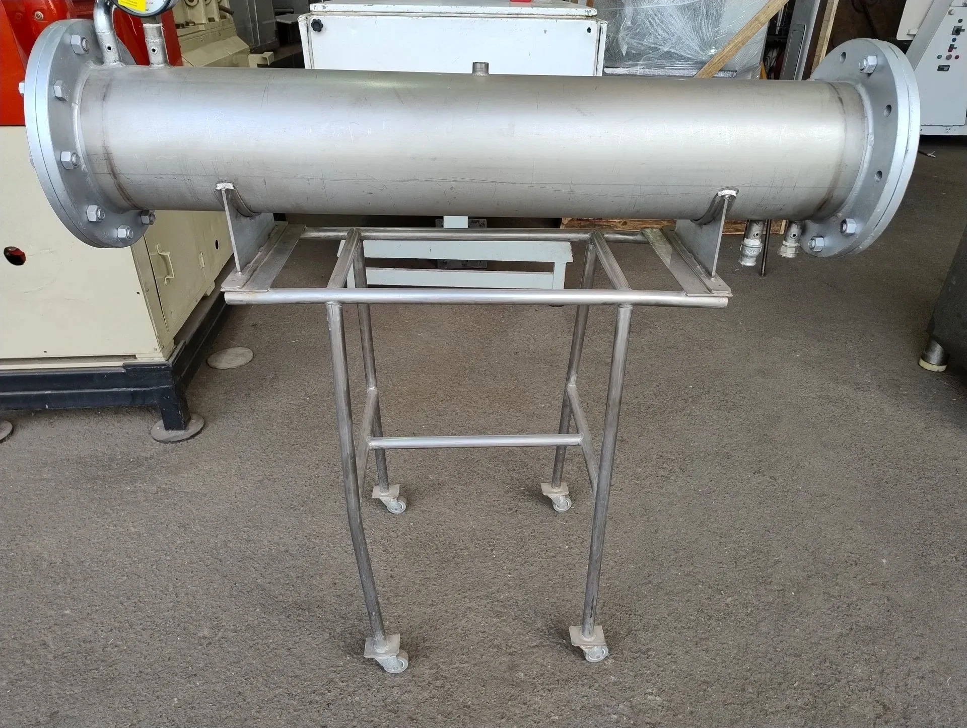 Trocador de calor casco e tubo Shell and Tube. Inundação do pasteurizador com água quente através de aquecedor. Vários tubos internos. Pasteurizador estava empregado em istema para produção de suco. Dimensões: - Diâmetro: 350 mm - Comprimento: 3,0 m