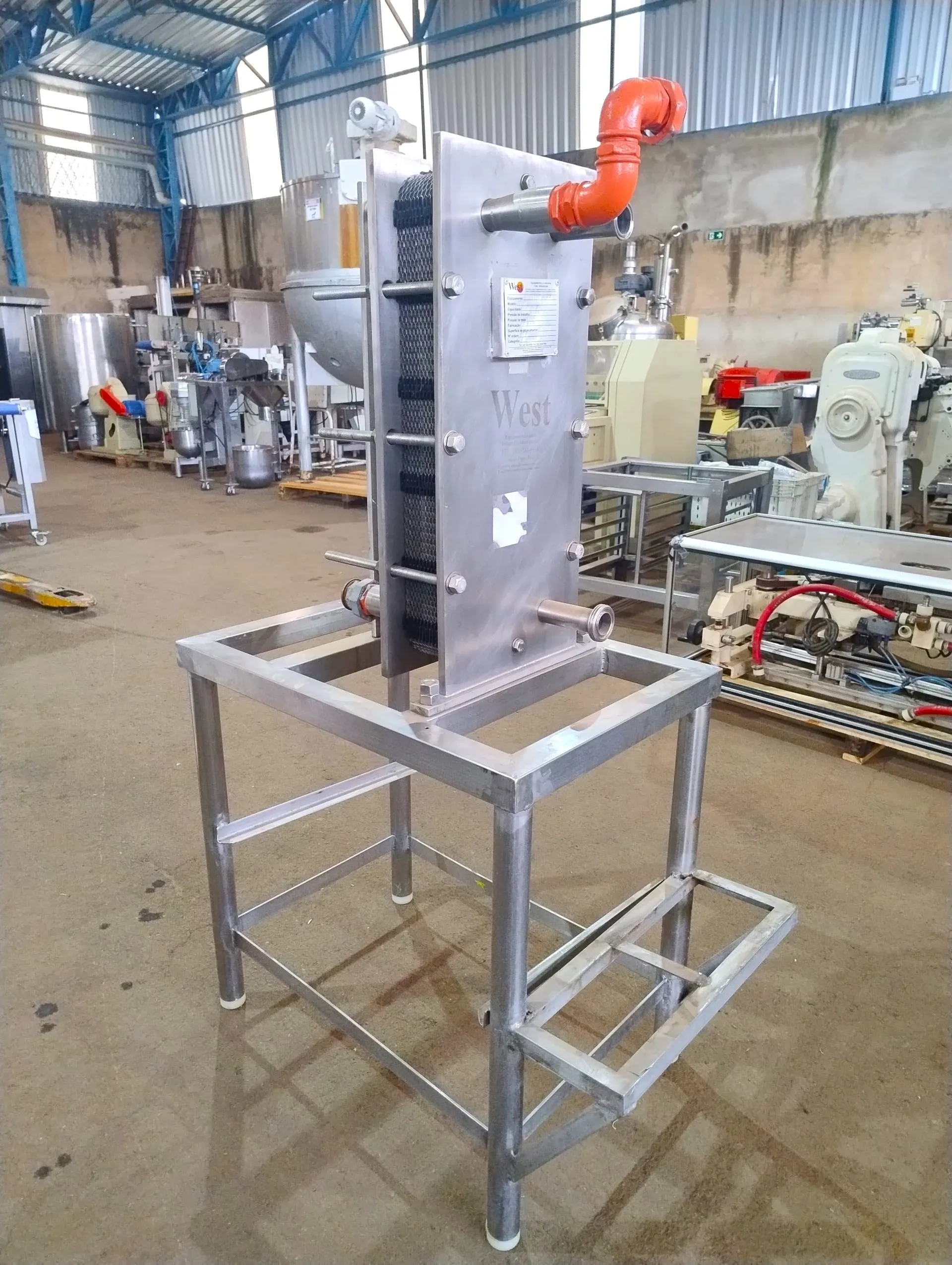 Trocador de Calor marca West modelo West-15. Trocador de Calor a Placas composto por pedestal maciço em aço inoxidável, placas corrugadas, tirantes para fixação do feixe de placas. Capacidade de 2.000 L/h até 10.000 L/h.