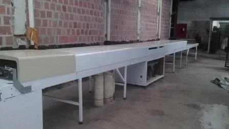 Túnel de resfriamento Hebleimar 22 m x 600 mm.  Características: 4 motores gerando 7,2 Kw de potência; controle de temperatura e controle da velocidade da esteira; esteira construída em PVC laminado.