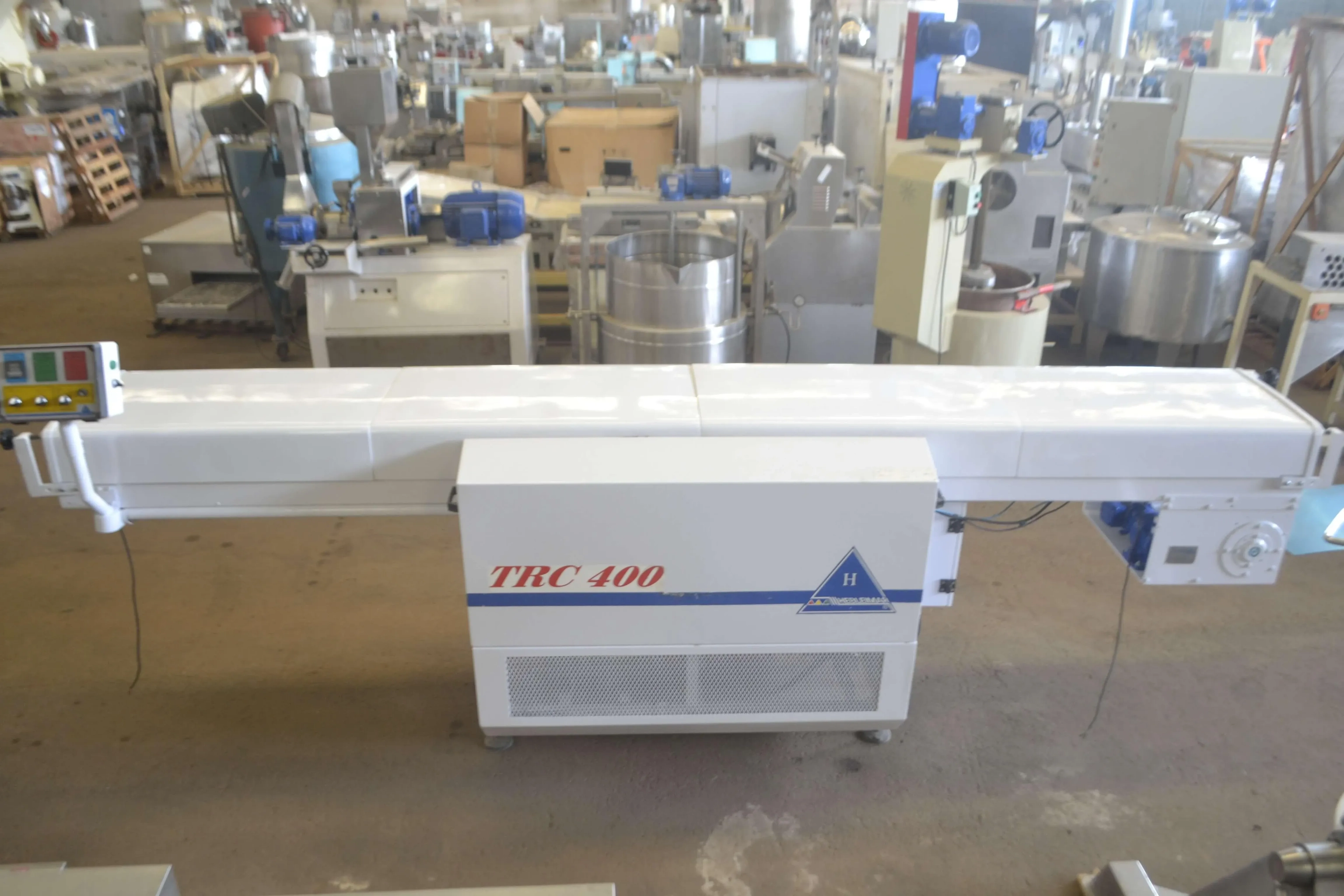 Túnel de resfriamento de chocolate 4 m x 400 mm marca Hebleimar. Modelo: TRC 400. Com estrutura metálica em aço carbono (pintura epóxi), duto com capotas em poliuretano expandido, esteira de lona e unidade frigorífica. Garante cristalização precisa, resultando em produtos resistentes ao calor e com tempo de prateleira otimizado. Com tração, mesas de entrada e saída e painel elétrico de comando. 0,99 Kw. 380 V.