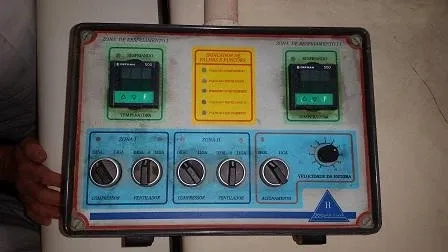 Túnel de resfriamento Hebleimar 22 m x 600 mm. Características: 4 motores gerando 7,2 Kw de potência; controle de temperatura e controle da velocidade da esteira; esteira construída em PVC laminado.