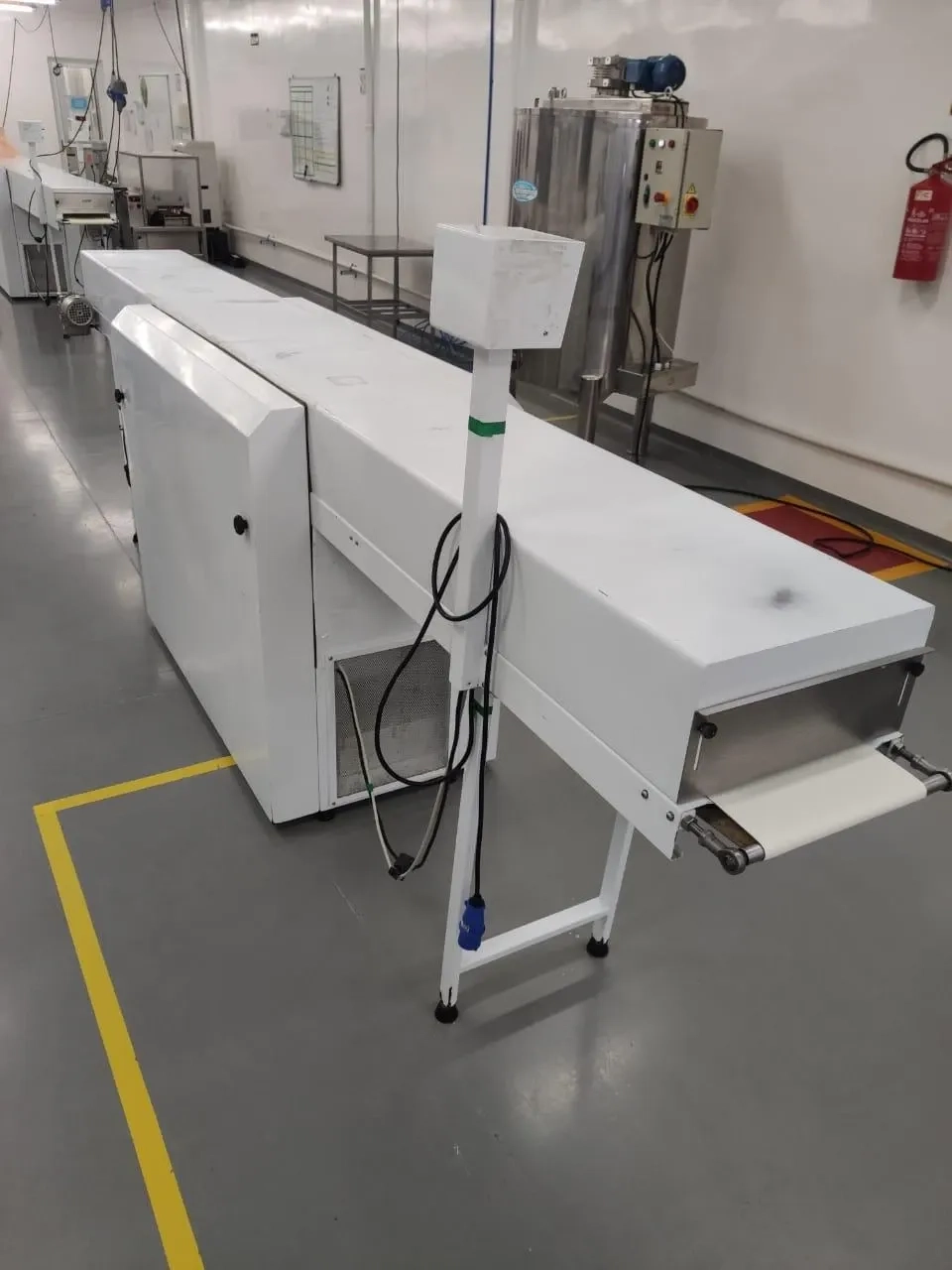 Túnel de resfriamento de chocolate 4 m x 300 mm marca Nowpex. Construído com estrutura em aço carbono e apoiado por duto com capotas em poliuretano expandido e unidade frigorífica instalada na parte inferior. Com compressor hermético marca Emerson Copeland.