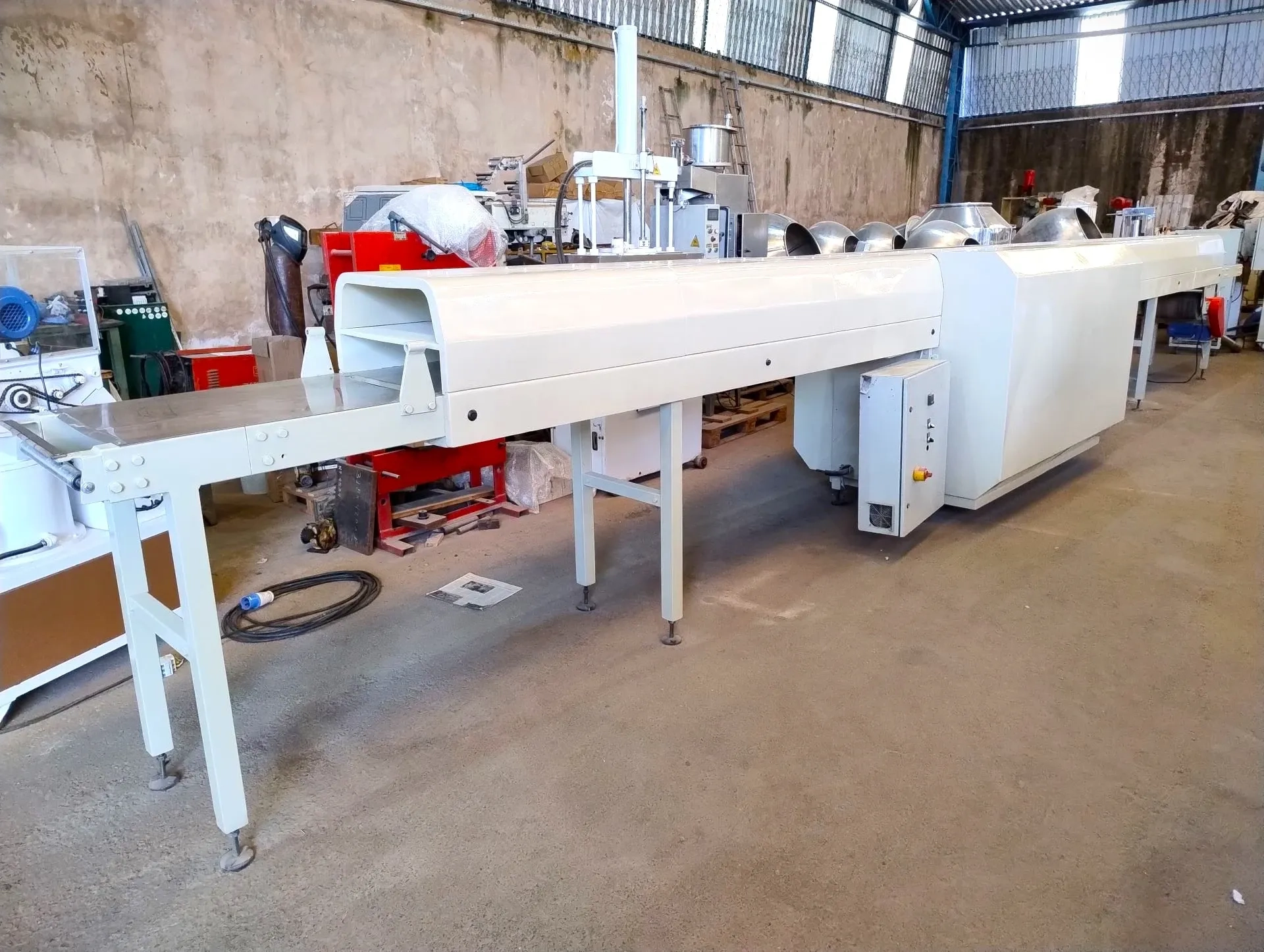 Túnel de resfriamento de chocolate 9 m x 560 mm. Com estrutura metálica em aço carbono (pintura epóxi), duto com capotas em poliuretano expandido, esteira de lona e unidade frigorífica. Garante cristalização precisa, resultando em produtos resistentes ao calor e com tempo de prateleira otimizado. Com tração, mesas de entrada e saída e painel elétrico de comando. Compressor 220-230 V 3 ~ 60 Hz 29 A max.
